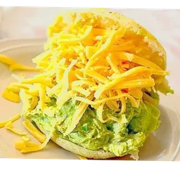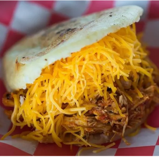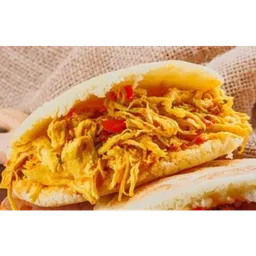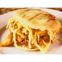 Arepa rellena de ensalada de pollo, aguacate, salsa de la casa y queso.