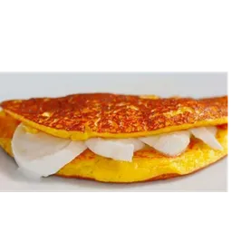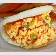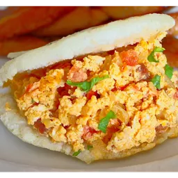 Arepa rellena de huevos revueltos con tomate y cebolla.