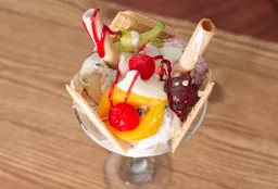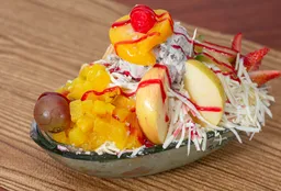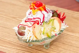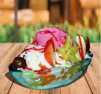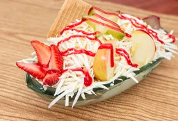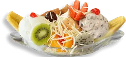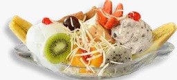 Banano, crema de leche, queso, tres porciones de helado, decorado de fruta y salsas.