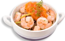 200 Gramos de camarón titi, salsa de la casa, huevo de codorniz, jugo de naranja y galletas de soda.