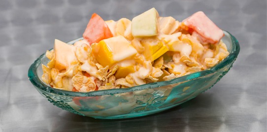 Yogurt, fruta picada, cereal.