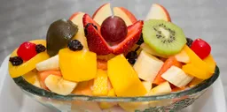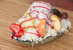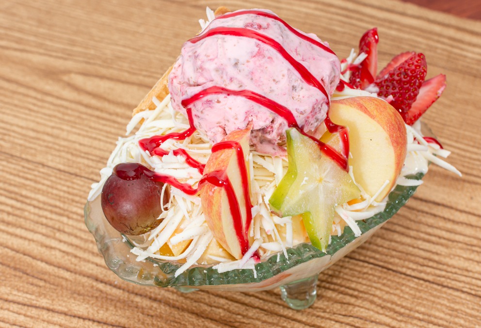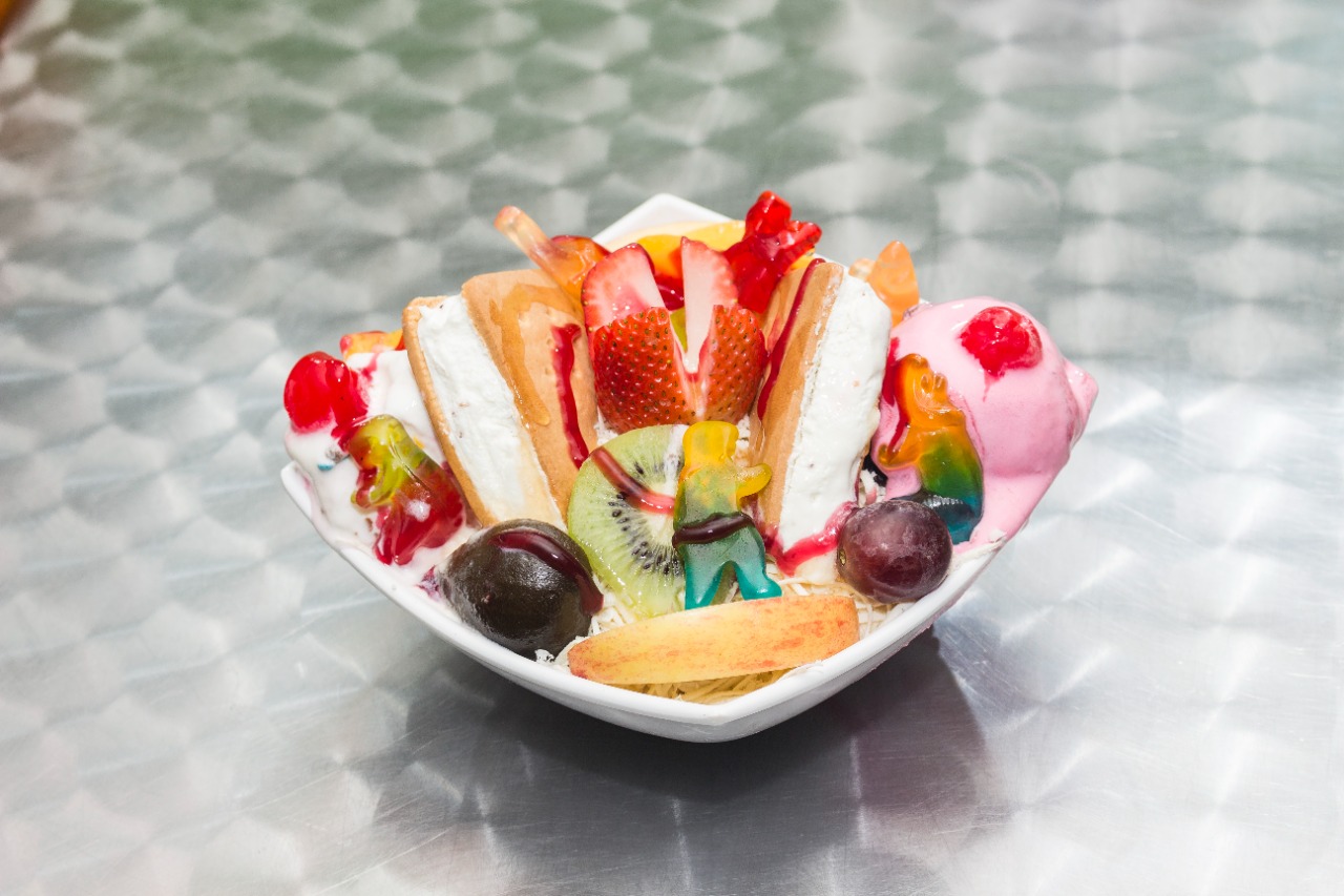 fruta picada, crema de leche, queso, helado platillo, salsas, kiwi, breva, cereza, durazno, gomas.