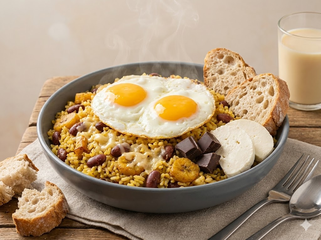 Calentado paisa, huevos al gusto (fritos, pericos o revueltos), bebida (café con leche, chocolate o americano), queso y pan.