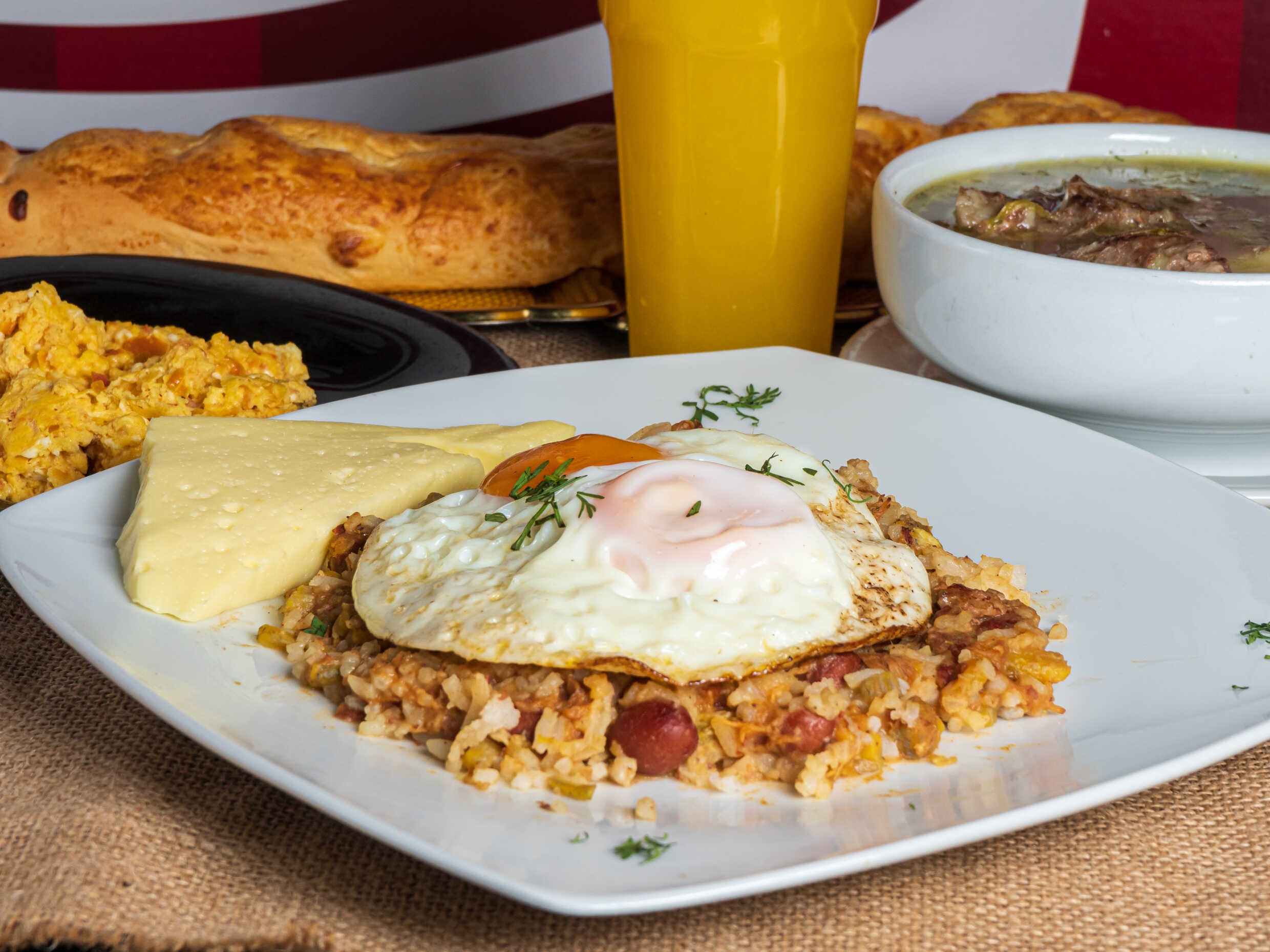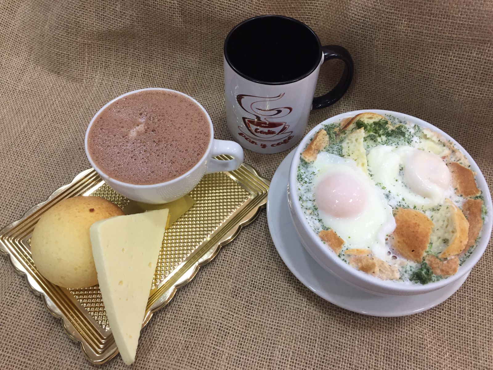 Changua especial con doble huevo, almojábana, calado y queso , agua leche, cebolla, sal, cilantro + bebida a elección, queso y pan.