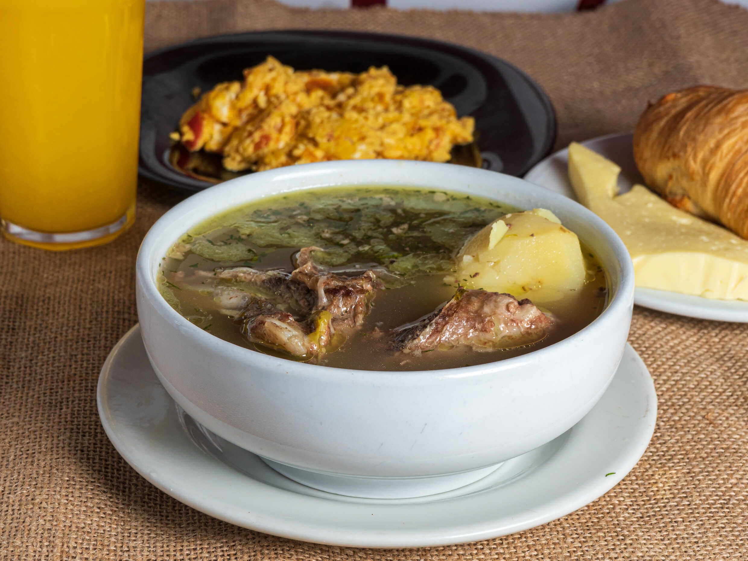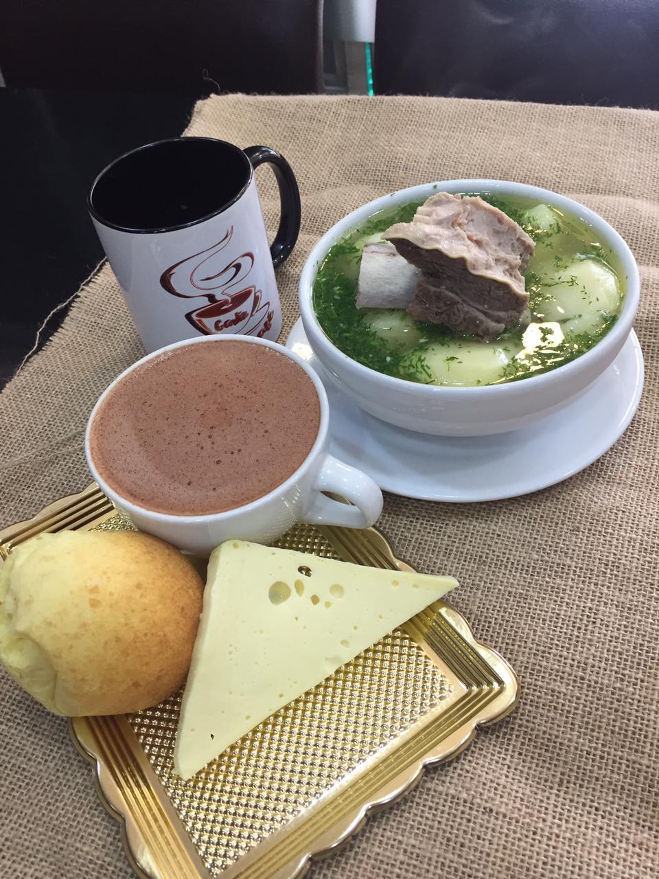 Delicioso caldo de costilla con papa, bebida a elección , queso y pan.