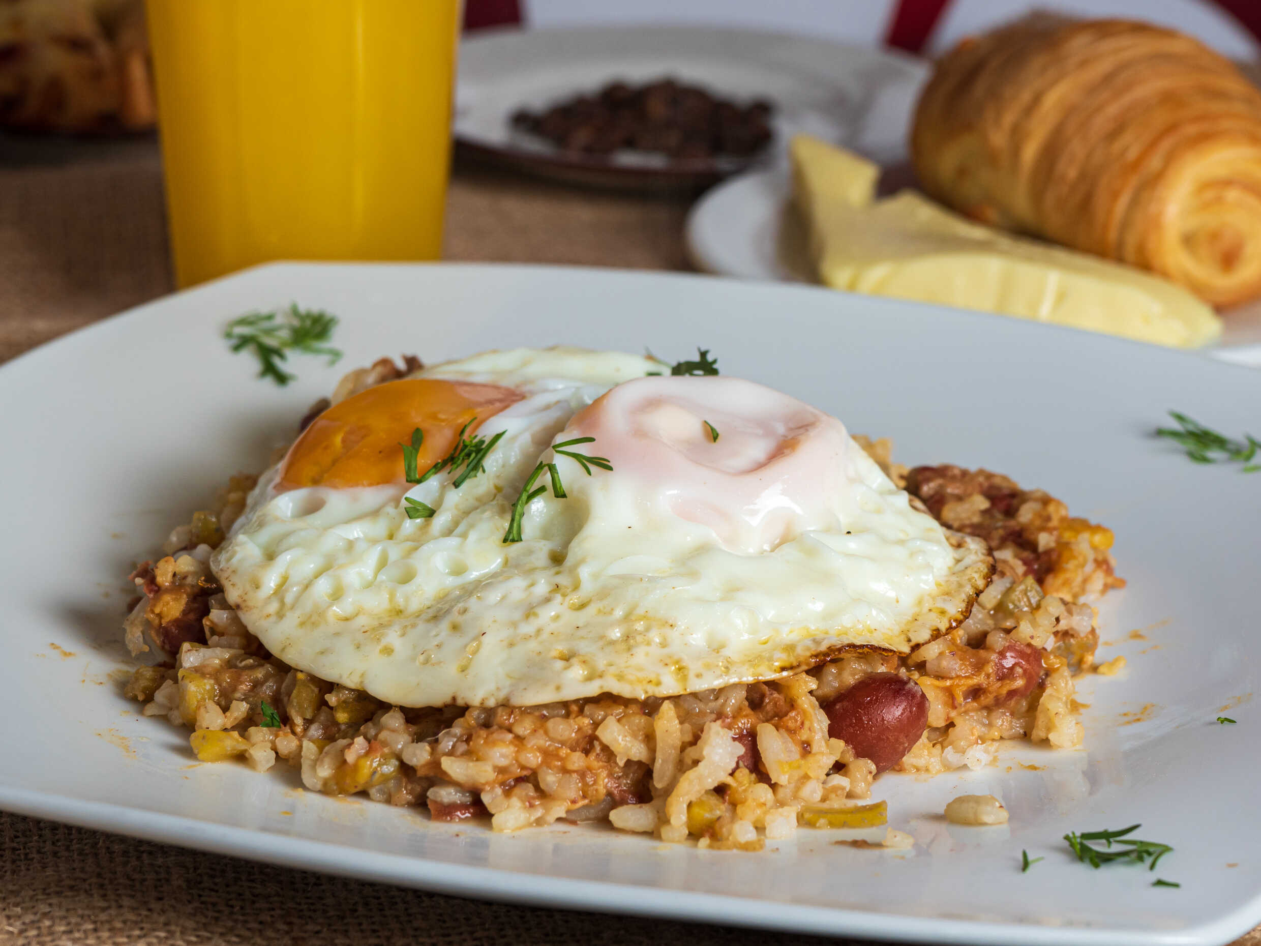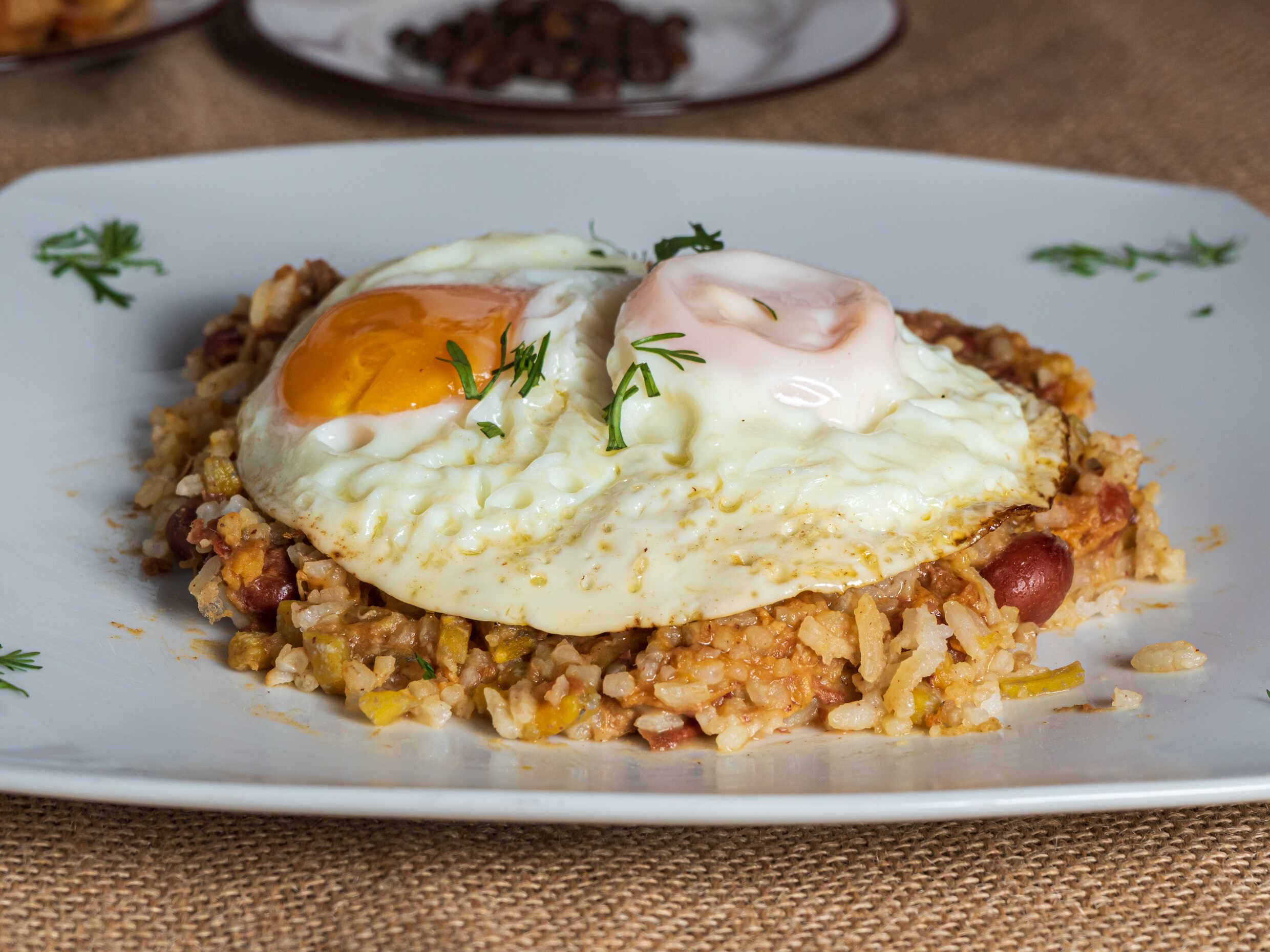 Exquisito calentado paisa con arroz, fríjoles, carne de res y de cerdo desmechada, trozos plátano maduro y 2 huevos.