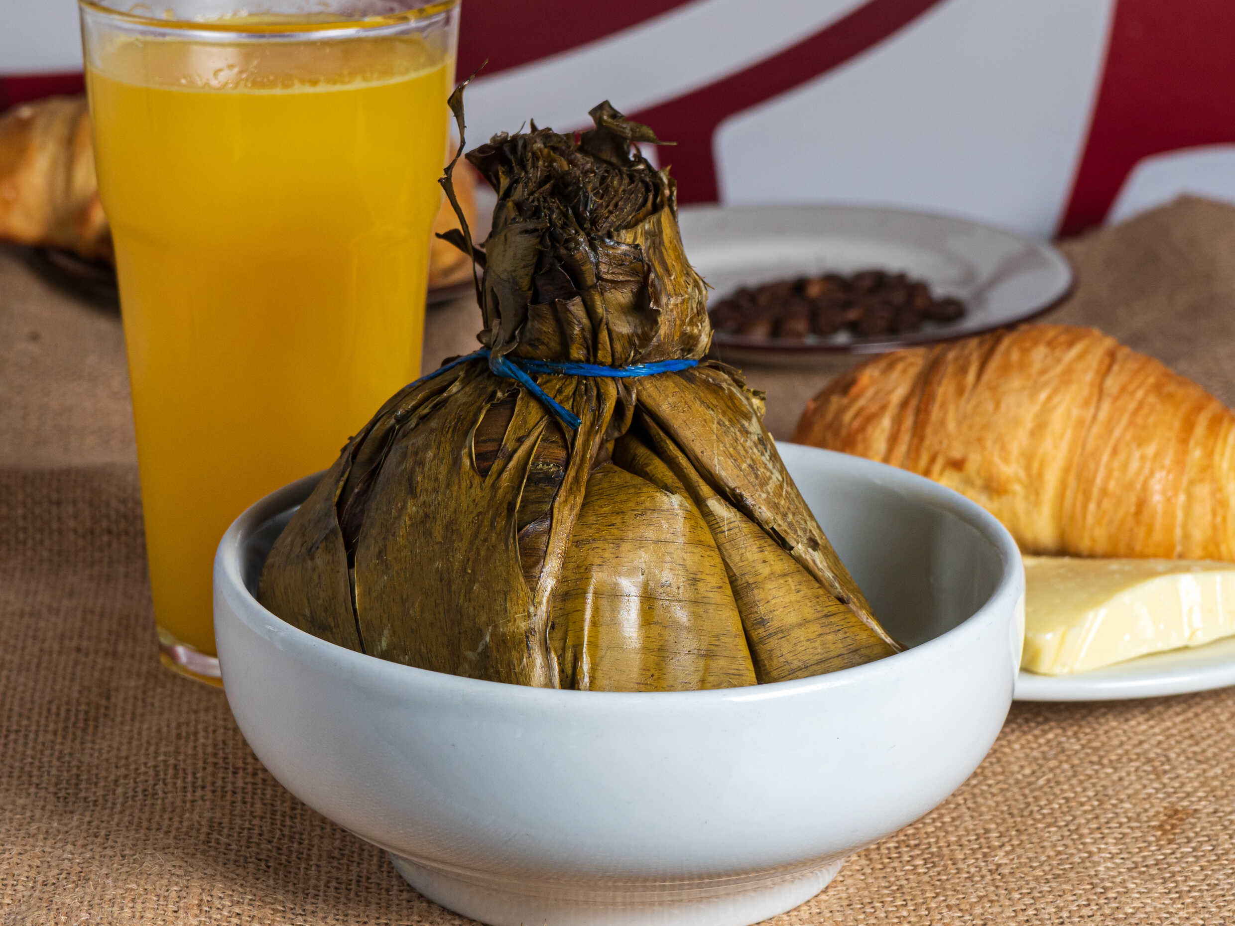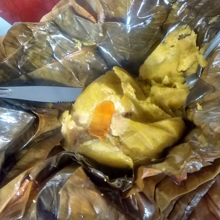 Delicioso tamal tolimense compuesto con arroz, rodaja de papa, rodaja huevos cocidos, alverja, pollo y rodajas de zanahoria.