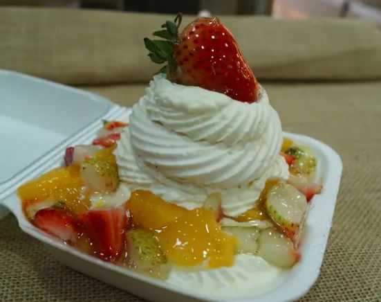 Merengue suizo relleno de crema batida con fruta, durazno y fresa