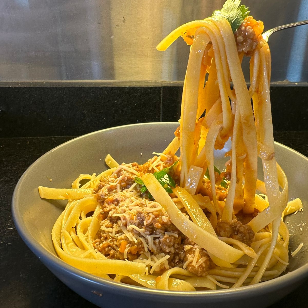 Fetuccini en salsa a base de carne de res y vegetales servido con queso parmesano.