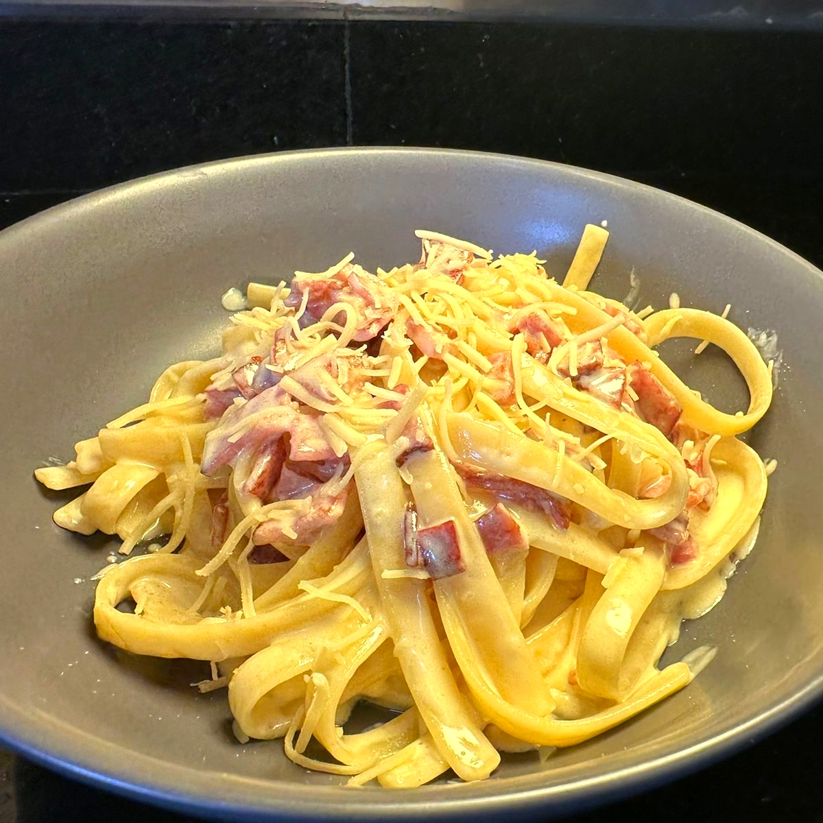 Fetuccini en salsa tradicional carbonara con trozos de tocineta y queso parmesano.