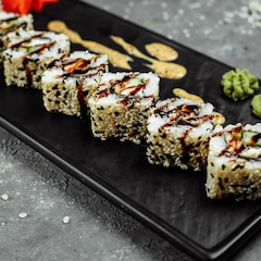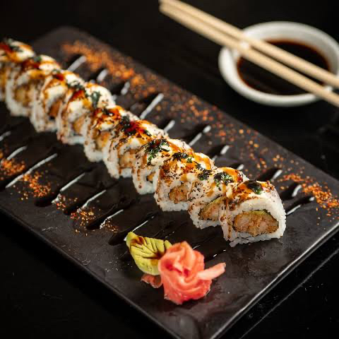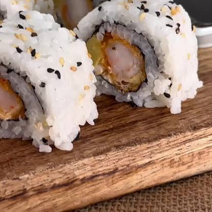 10 rollos relleno de queso crema, aguacate y camaron tempura con topping de ajonjoli