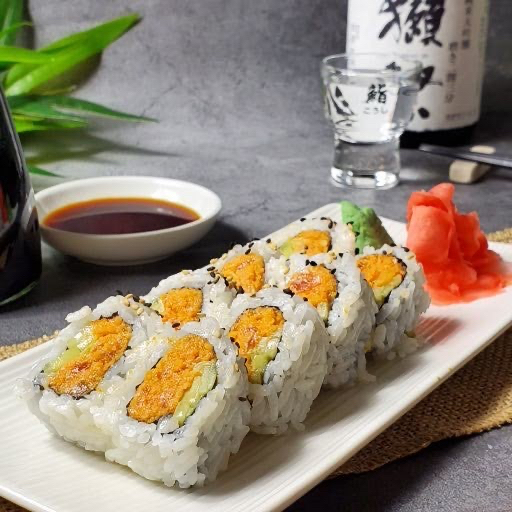10 rollos relleno de aguacate y ensalada dinamita con topping de ajonjol
