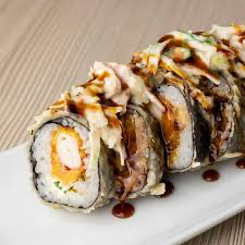 10 rollo de queso crema, aguacate, palmito de cangrejo tempura con topping de ensalada dinamita