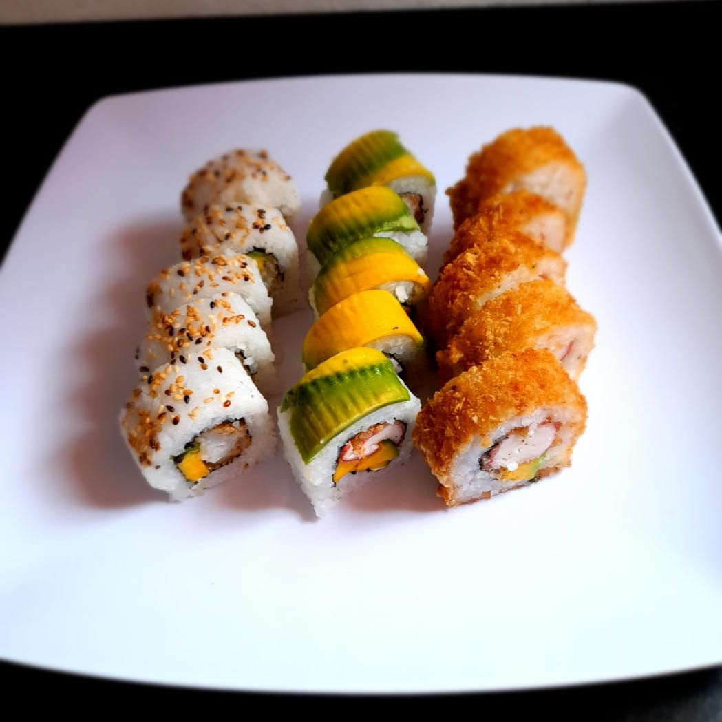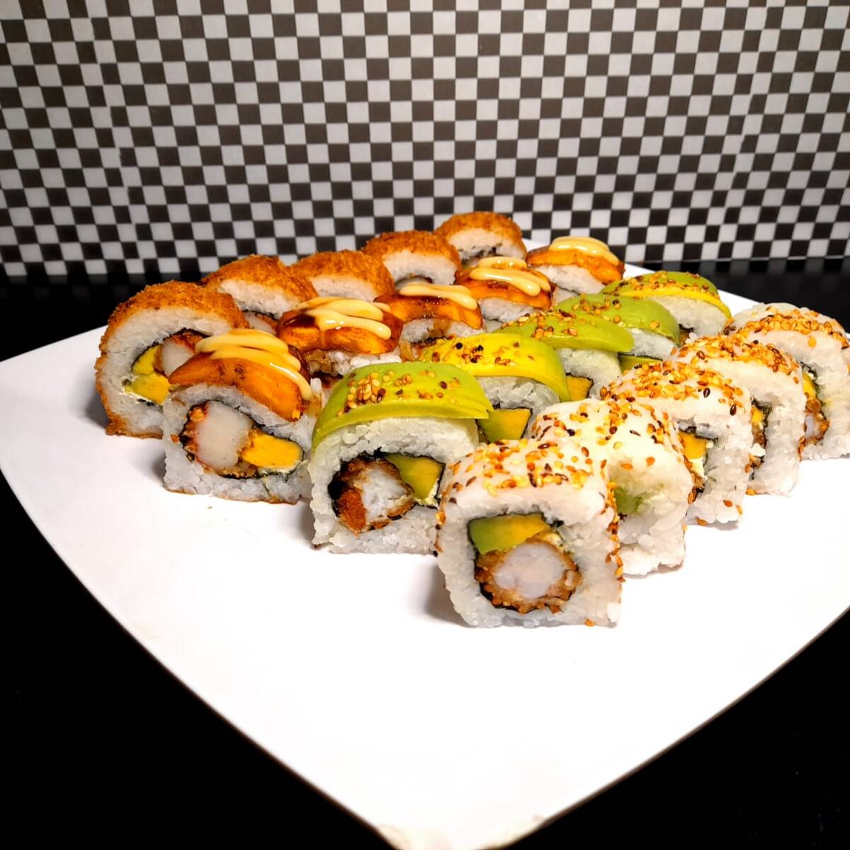 20 Sushi tempura, 10 avocado 10 california, 10 dinamiral, 10 robalo crunck, 10 camaron roll 10 salmón skin, 10 salmón crispy, 10 latín .