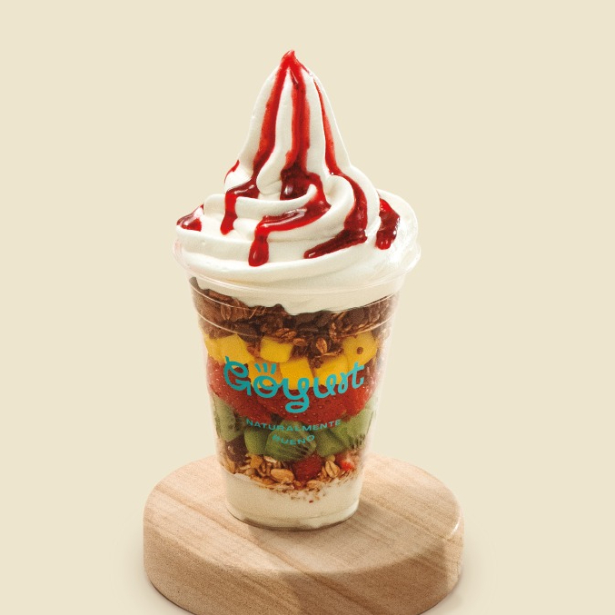 Go Parfait de Yogurt Helado (150gr) con cinco toppings y una salsa a elección.