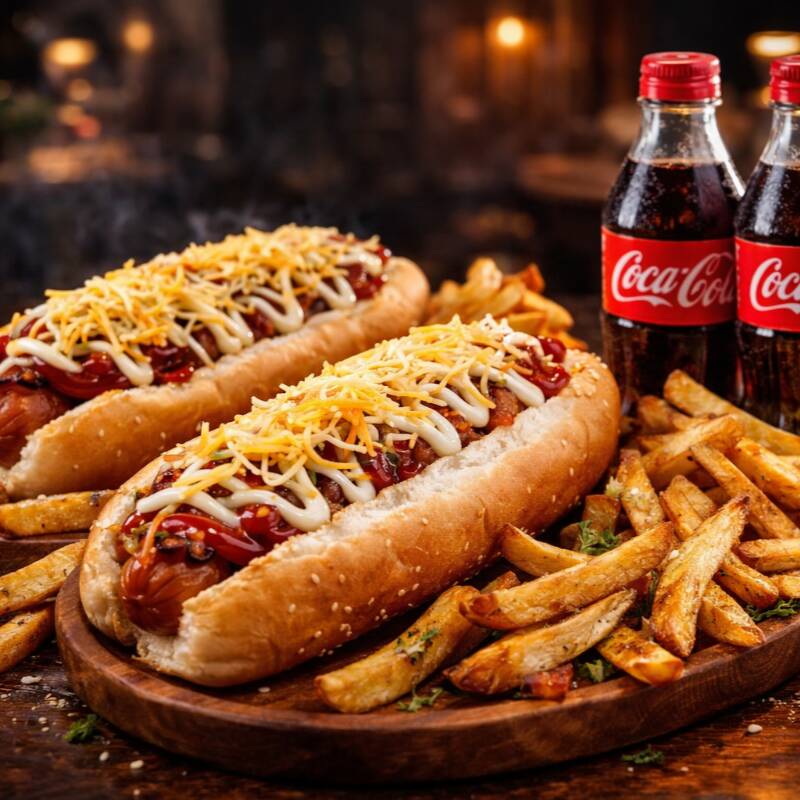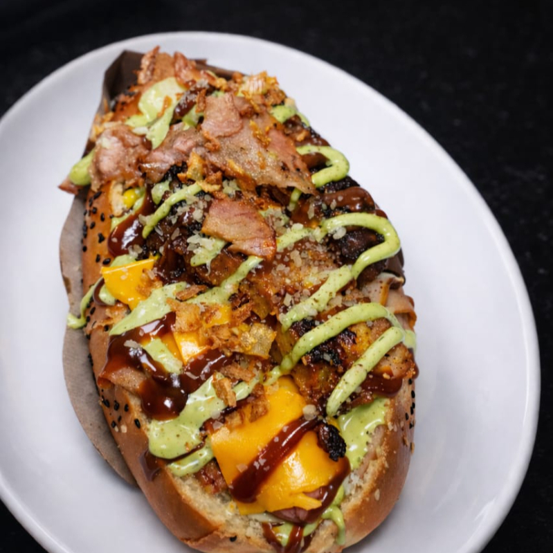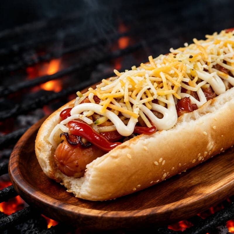 Salchicha americana, pan artesanal, ternera, cerdo, queso mozzarella, queso cheddar, queso parmesano, cebolla grillé, maíz tierno y salsas de la casa