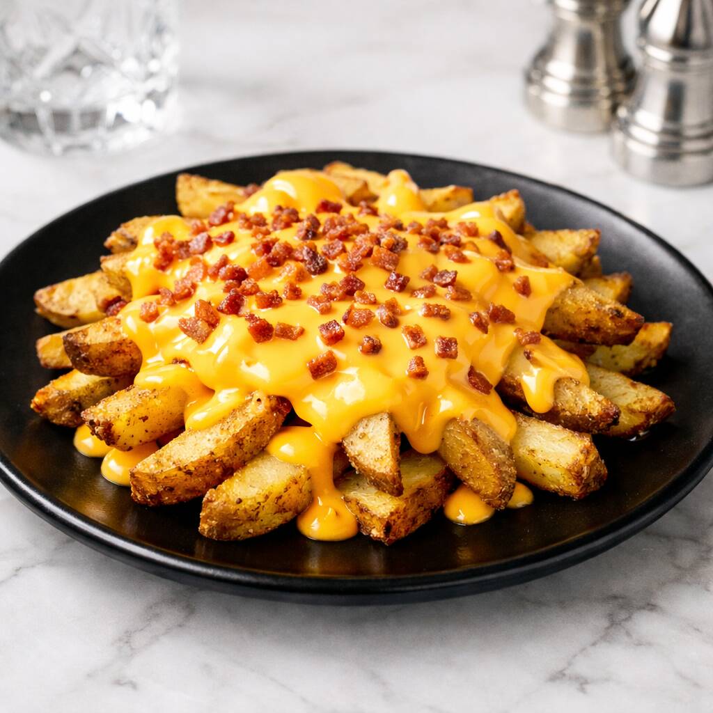Papas rústicas a la francesa cubiertas de queso cheddar y pequeños trozos de tocineta