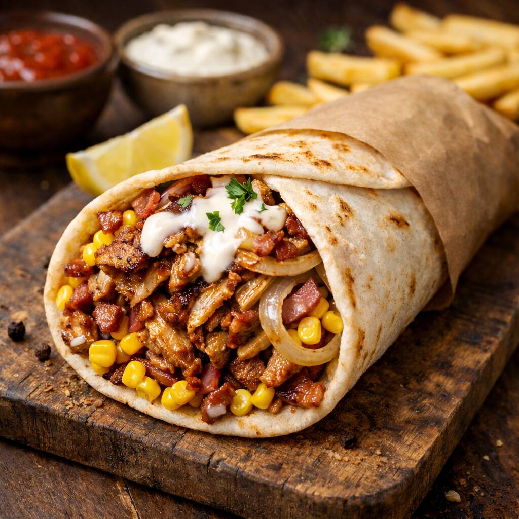Pan árabe relleno de pechuga, cerdo, res, tocineta, queso cheddar queso mozzarella, queso costeño, maíz tierno, cebolla grillé, papa chip, salsas de la casa
