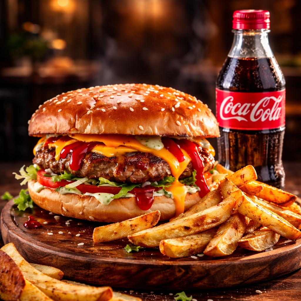 Hamburguesa Sencilla*1 + Coca cola 250 ml*1 + Papas Rusticas a la Francesa*1