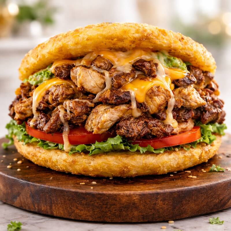 Arepa de maíz frita rellena de pechuga, cerdo, res, queso cheddar, queso mozzarella, queso costeño, maíz tierno, cebolla grillé, lechuga, tomate y salsas de la casa