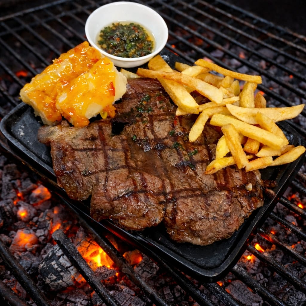 Churrasco de 400 gramos, acompañado de papas rústicas a la francesa y yuca en salsa