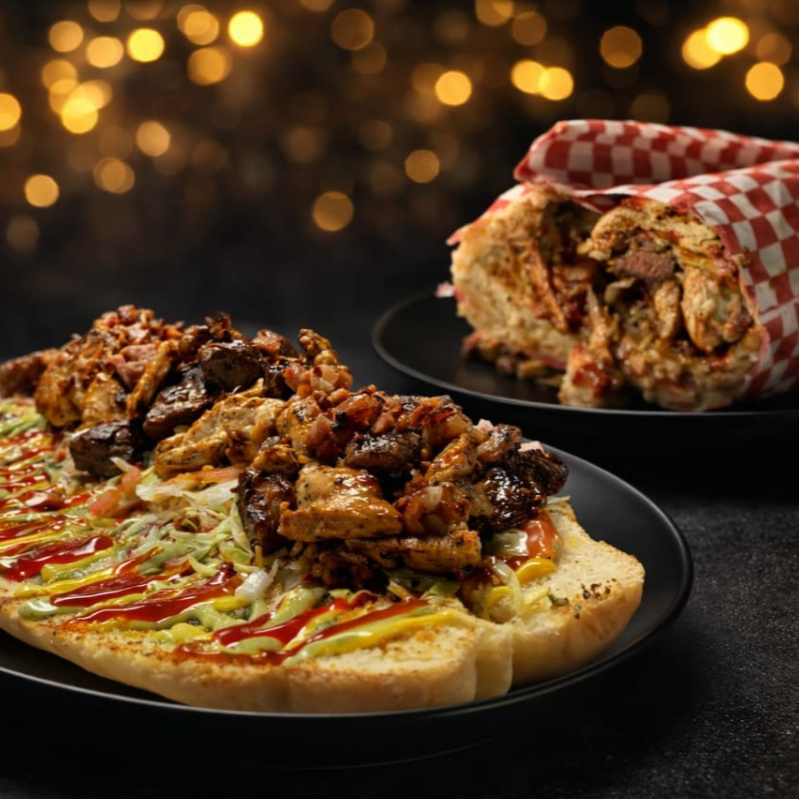 Pan campesino de 30 centímetros relleno de pechuga, cerdo, res, tocineta picada, queso cheddar, queso mozzarella, queso costeño, maíz tierno, cebolla grillé, papá chip, lechuga, tomate y salsas de la casa.