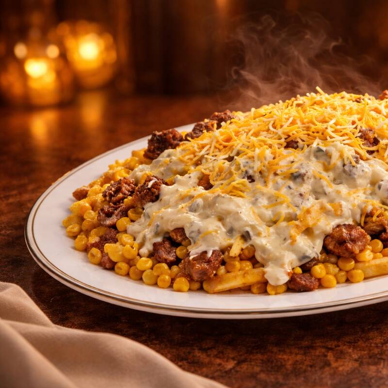 Base de papas a la francesa con pechuga, cerdo, res, queso cheddar, queso mozzarella, queso costeño, bañadas en salsa bechamel y papa chip