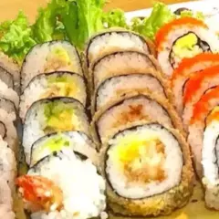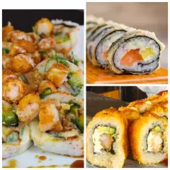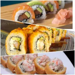 6 California crispy: palmito de cangrejo, queso crema, aguacate, 6 de stunami: sushi tempura relleno de cangrejo, queso crema, aguacate topping de ensalada de cangrejo y wakame bañado en salsa tokio y anguila, 6 avocado roll: relleno de camarón crispy, queso crema y aguacate con topping de aguacate bañado en salsa anguila. 6 Tekamaki de salmón.