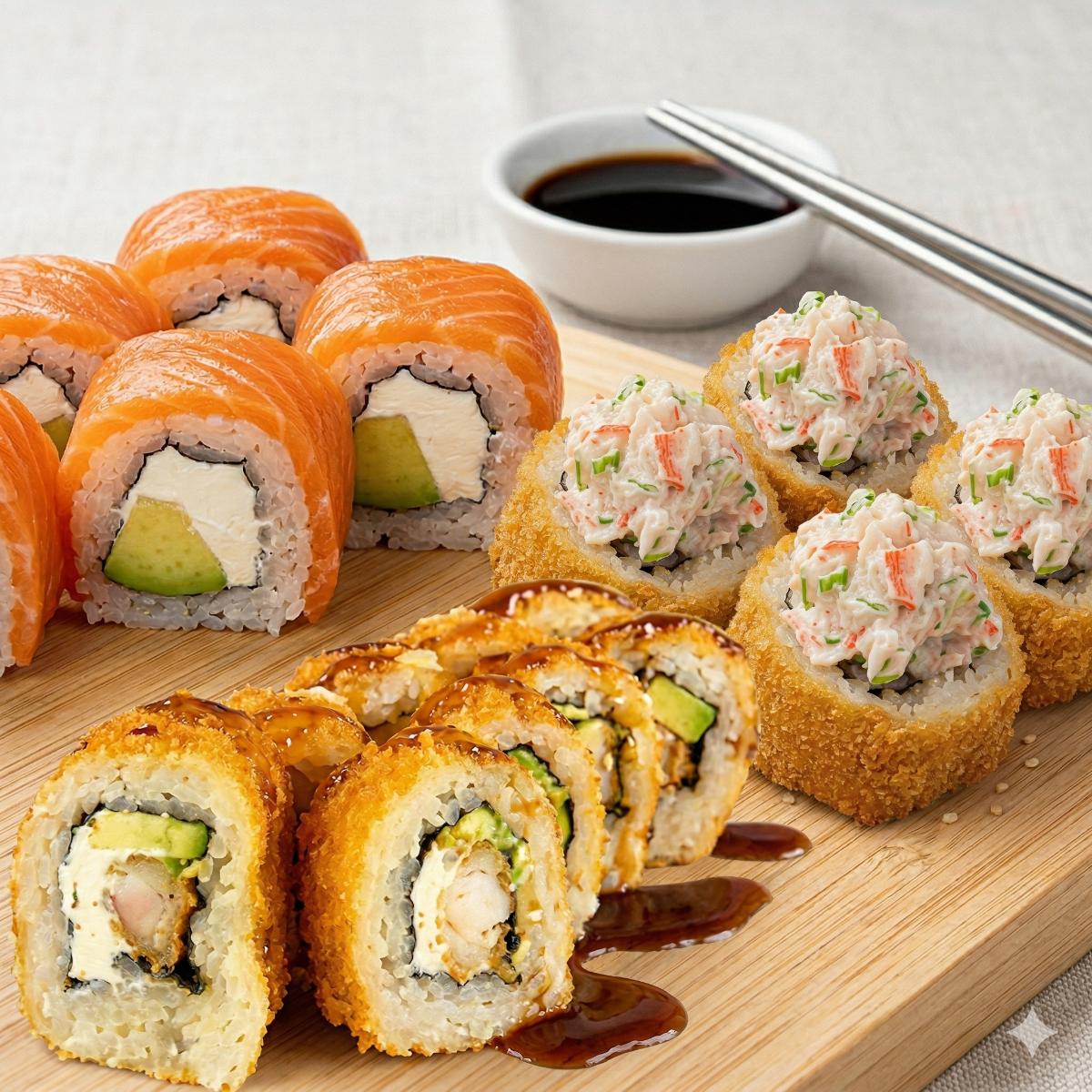 12 Tiger: palmito cangrejo, salmón fresco, queso crema, aguacate,topping: salsa anguila y salsa Tokio + 12 de California: palmitos de cangrejo, queso crema, aguacate, topping: massago + 12 de Alaska roll: relleno de salmón fresco, aguacate, queso crema.