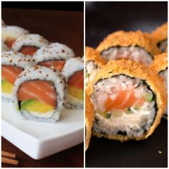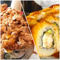 12 Bocados de philadelfia tempura: Relleno de salmón fresco, queso crema, aguacate+ 12 bocados de crazy tempura: Rollo crocante, relleno de camarón crispy, palmito de cangrejo, aguacate, topping salsa anguila.