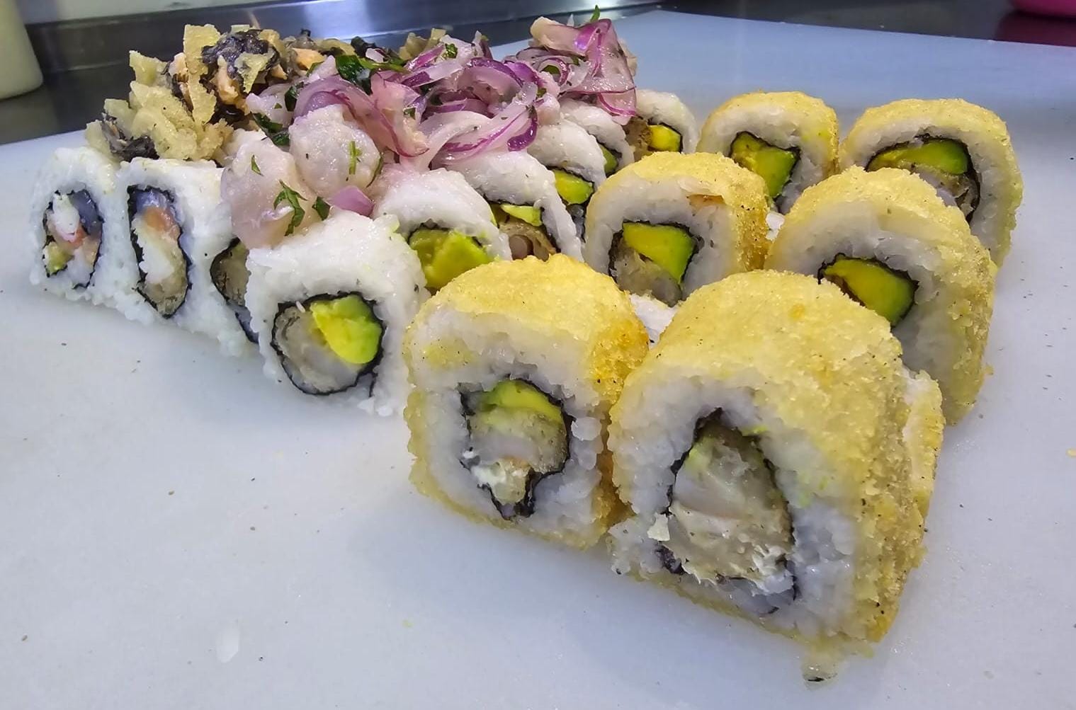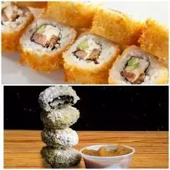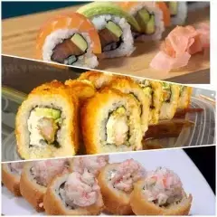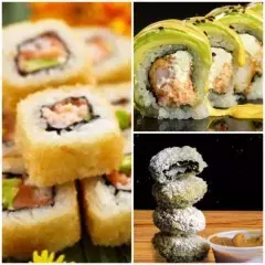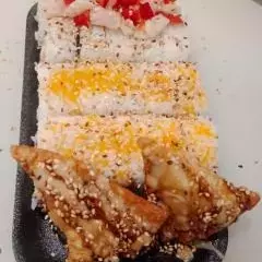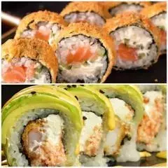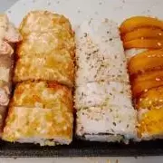 6 California crispy: palmito de cangrejo, queso crema, aguacate, 6 de stunami: sushi tempura relleno de cangrejo, queso crema, aguacate topping de ensalada de cangrejo y wakame bañado en salsa tokio y anguila, 6 avocado roll: relleno de camarón crispy, queso crema y aguacate con topping de aguacate bañado en salsa anguila. 6 Tekamaki de salmón.