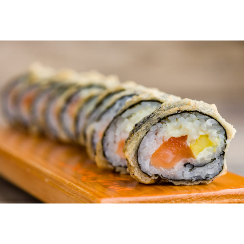 500 g Con doble porción de salmón tempura, queso crema, bastones de plátano.