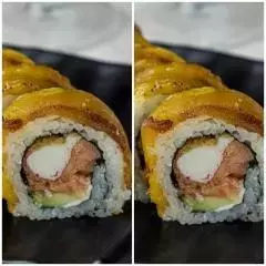 12 Piezas con salsa de soya, teriyaki y palillos, rollo relleno de camarón apanado, queso crema, aguacate topping finas laminas de salmón fresco.