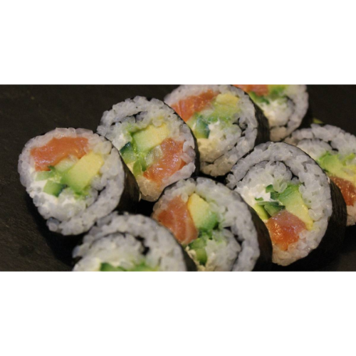 Sushi relleno de aguacate ,queso crema y salmón fresco con topping de lluvia de sesamo.