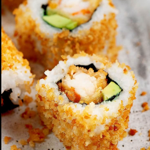 1 Rollo apanado de 12 bocado, relleno de salmón tempura, queso crema y aguacate.