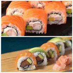 12 Makis de caribe roll salmón tempura, queso crema, aguacate con topping de coco crocante, 12 makis de california tradicional: palmito crocante, queso crema, aguacate con topping de massago, 5 und de camarones apanados bañados en salsa anguila.