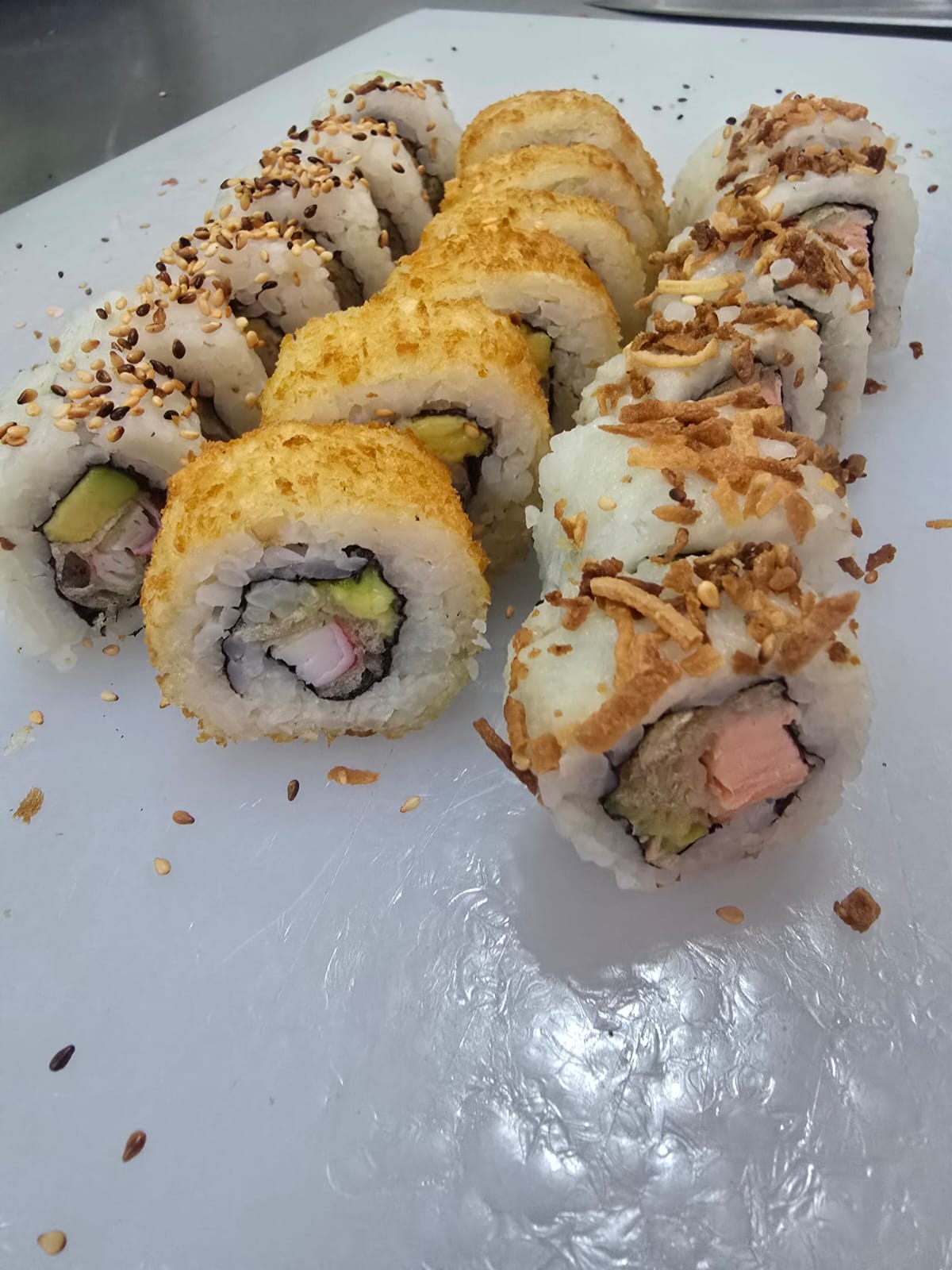 6 California crispy: palmito de cangrejo, queso crema, aguacate, 6 de stunami: sushi tempura relleno de cangrejo, queso crema, aguacate topping de ensalada de cangrejo y wakame bañado en salsa tokio y anguila, 6 avocado roll: relleno de camarón crispy, queso crema y aguacate con topping de aguacate bañado en salsa anguila. 6 Tekamaki de salmón.