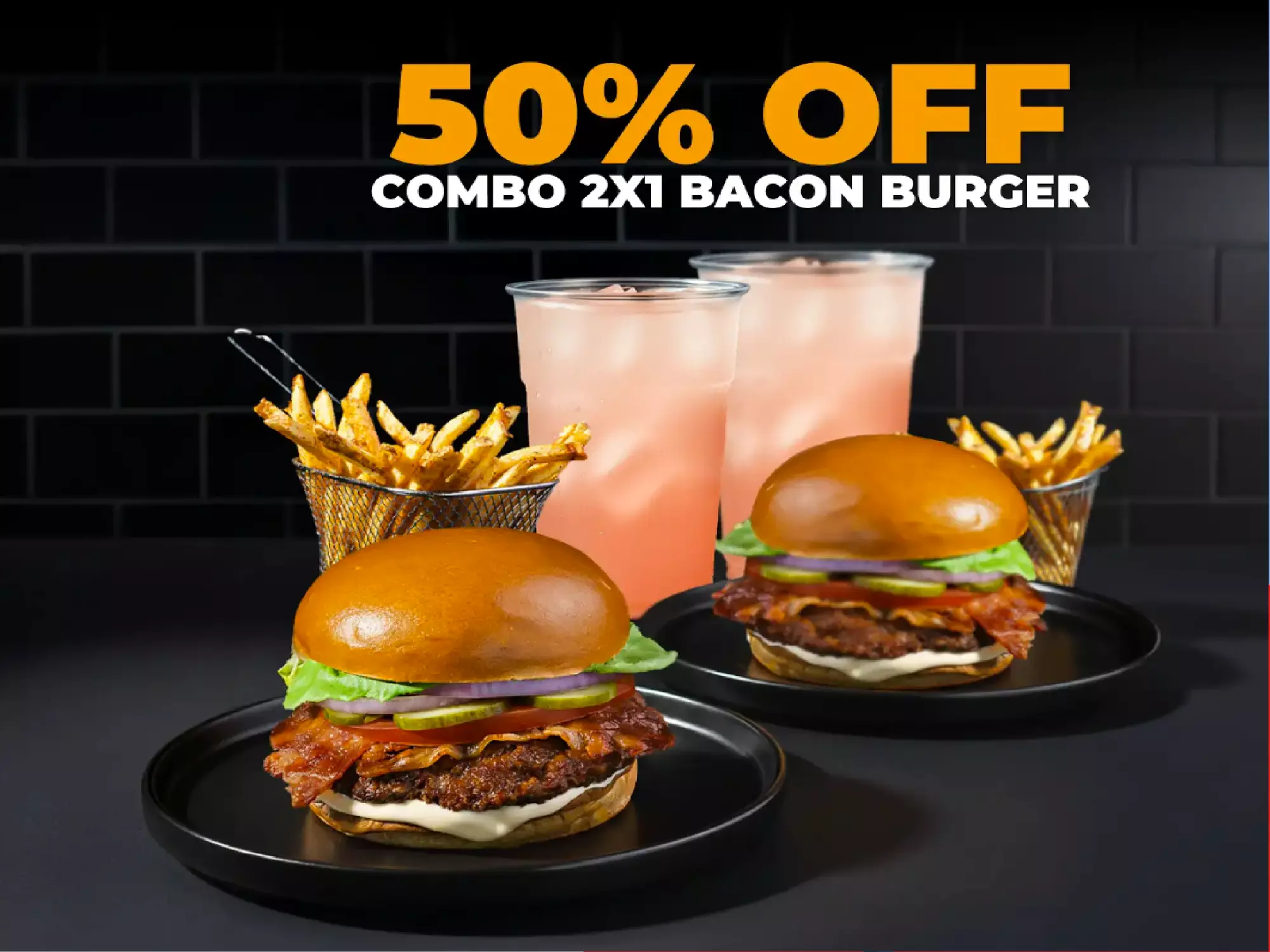 Combo 2X1 Bacon Burger 2 Hamburguesas de res 100% madurada de 125gr, lechuga, pepinillos, tomate, cebolla, tocineta y salsa de ajo + 2 papas + 2 bebidas