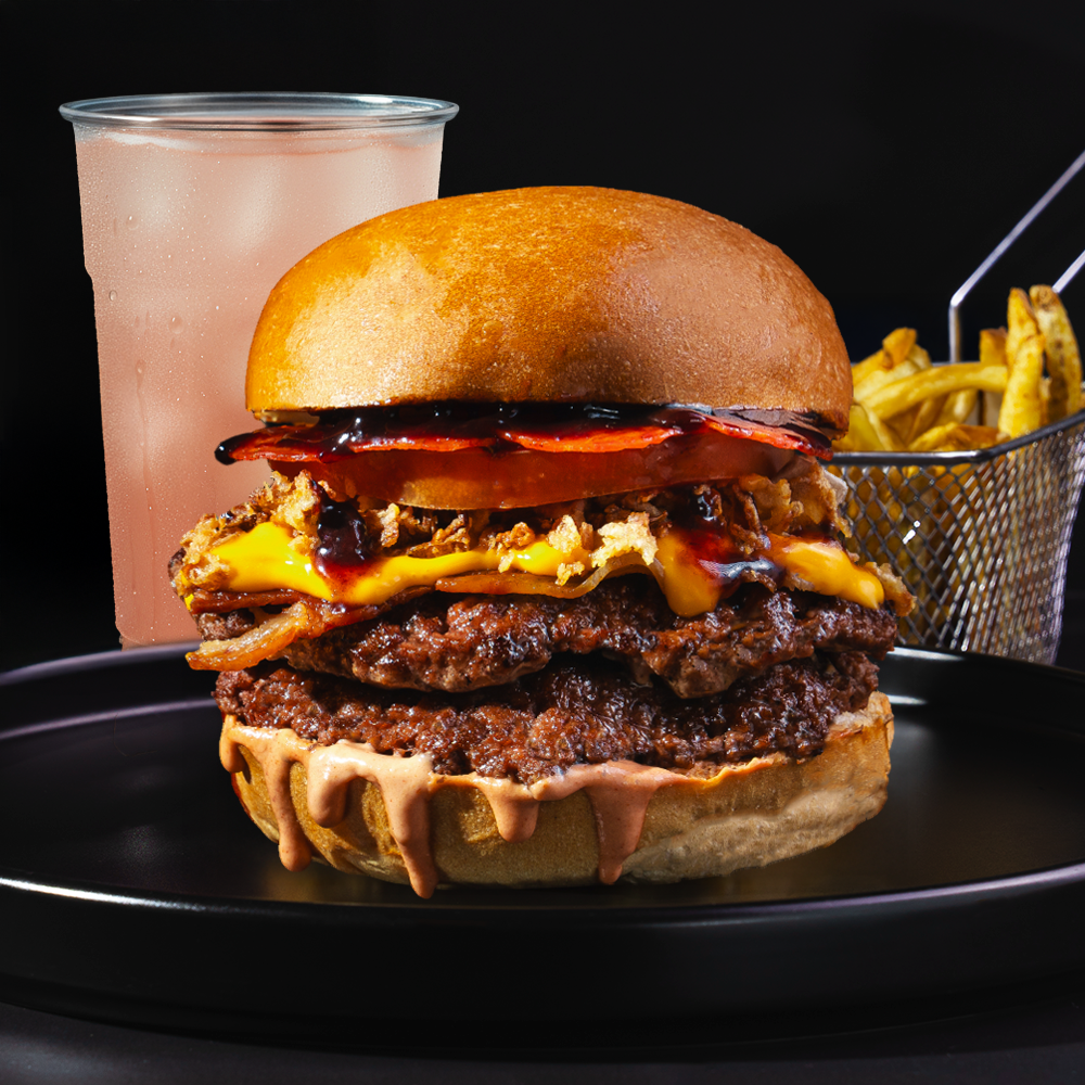 Dos carnes de res 100% madurada cada una de 125g, doble Tocineta, costra de queso mozzarella, mayonesa ahumada, cebolla caramelizada, Salsa Buffalo levemente picante y pan brioche sellado + papas + bebida