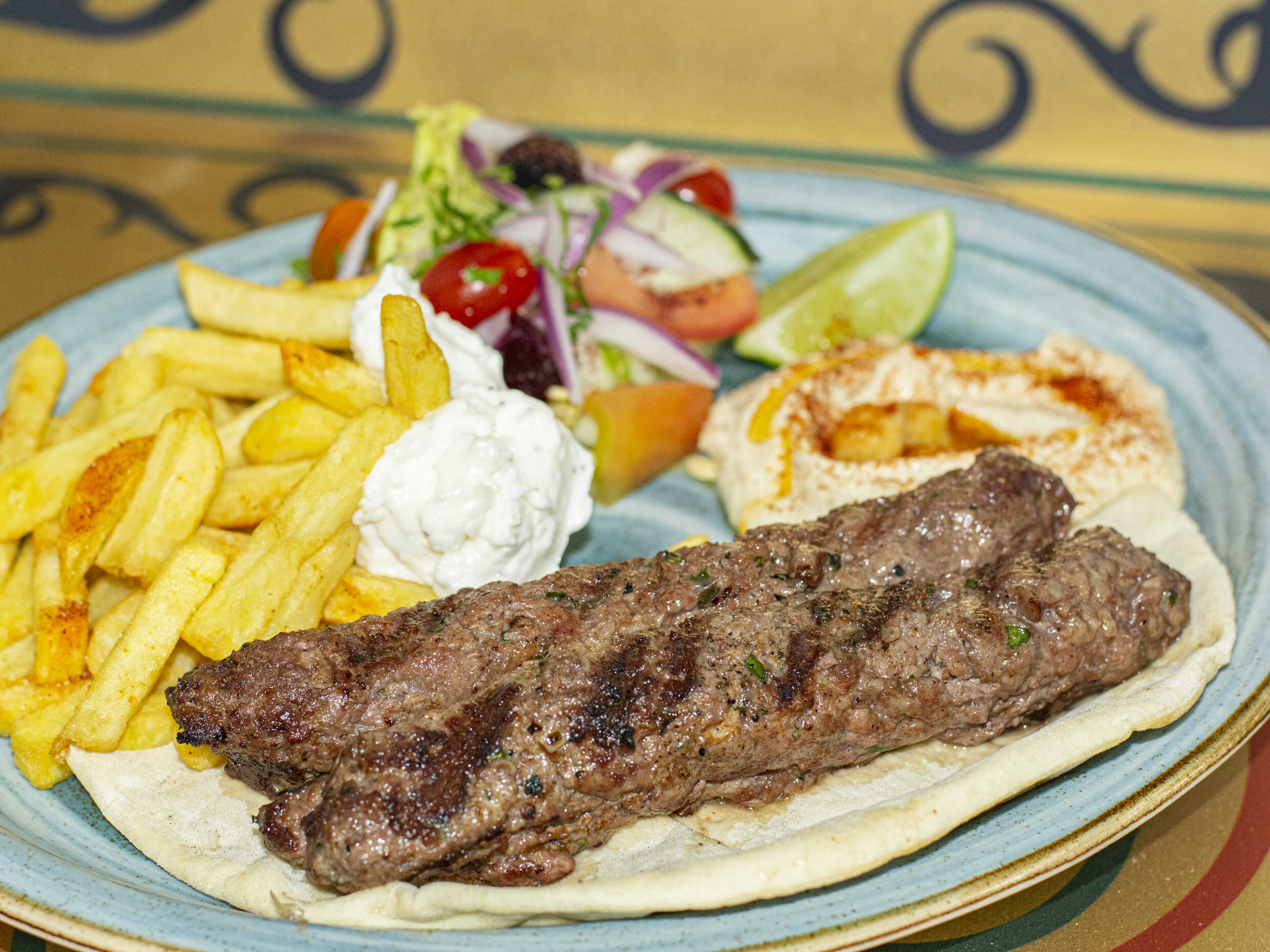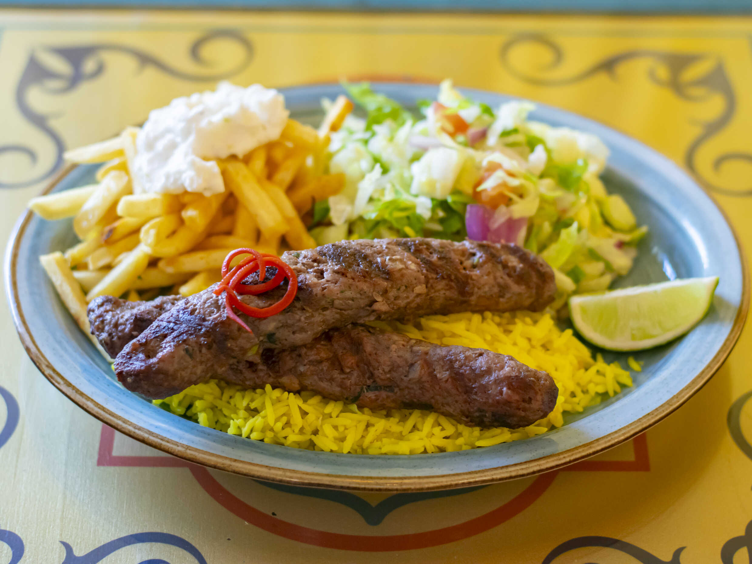 Carne de cordero picada a la parrilla. Acompañado de arroz basmati, patatas fritas y ensalada.