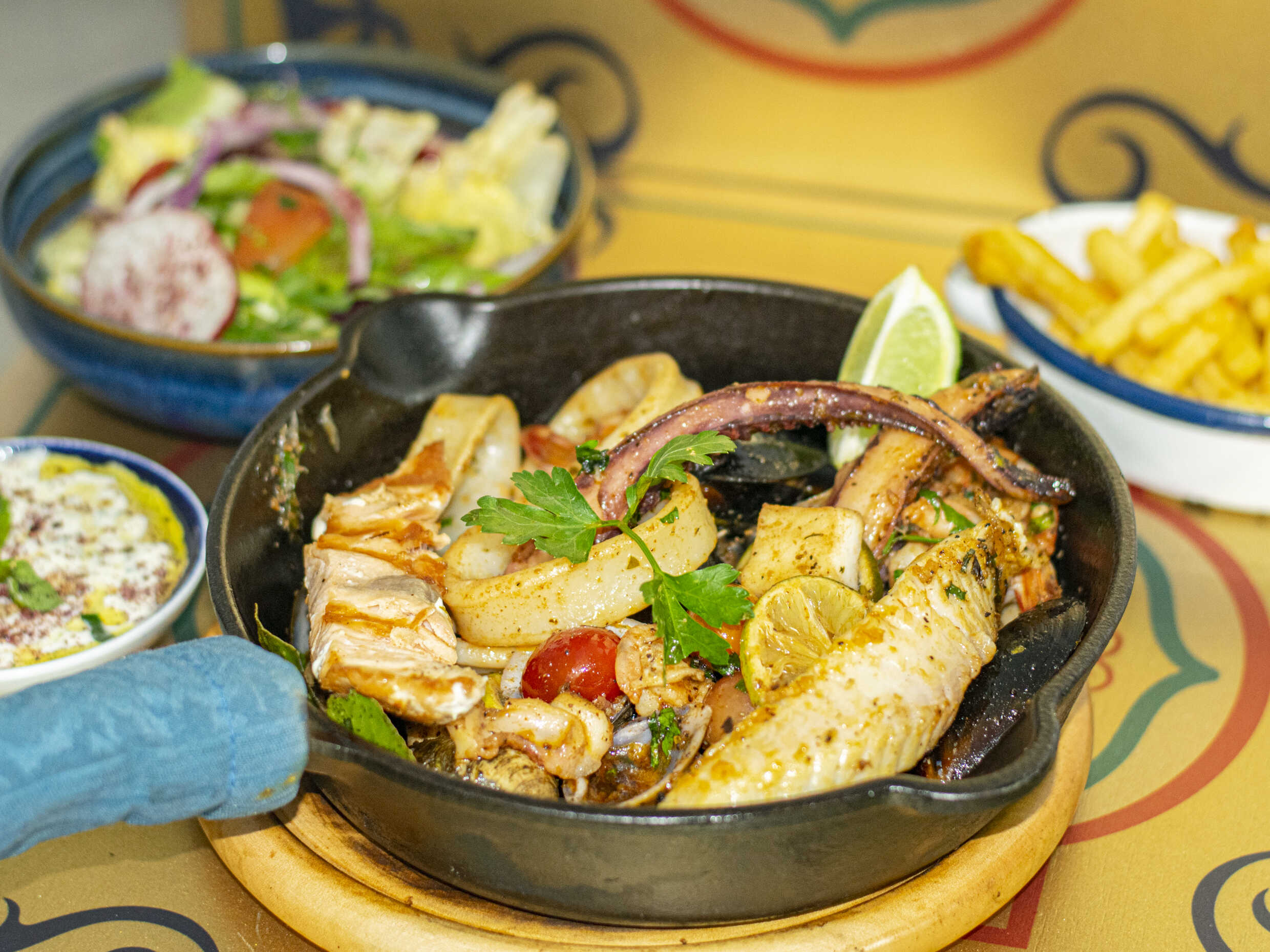 Mixtura de mariscos a la parrilla. Acompañada de patatas fritas y ensalada.