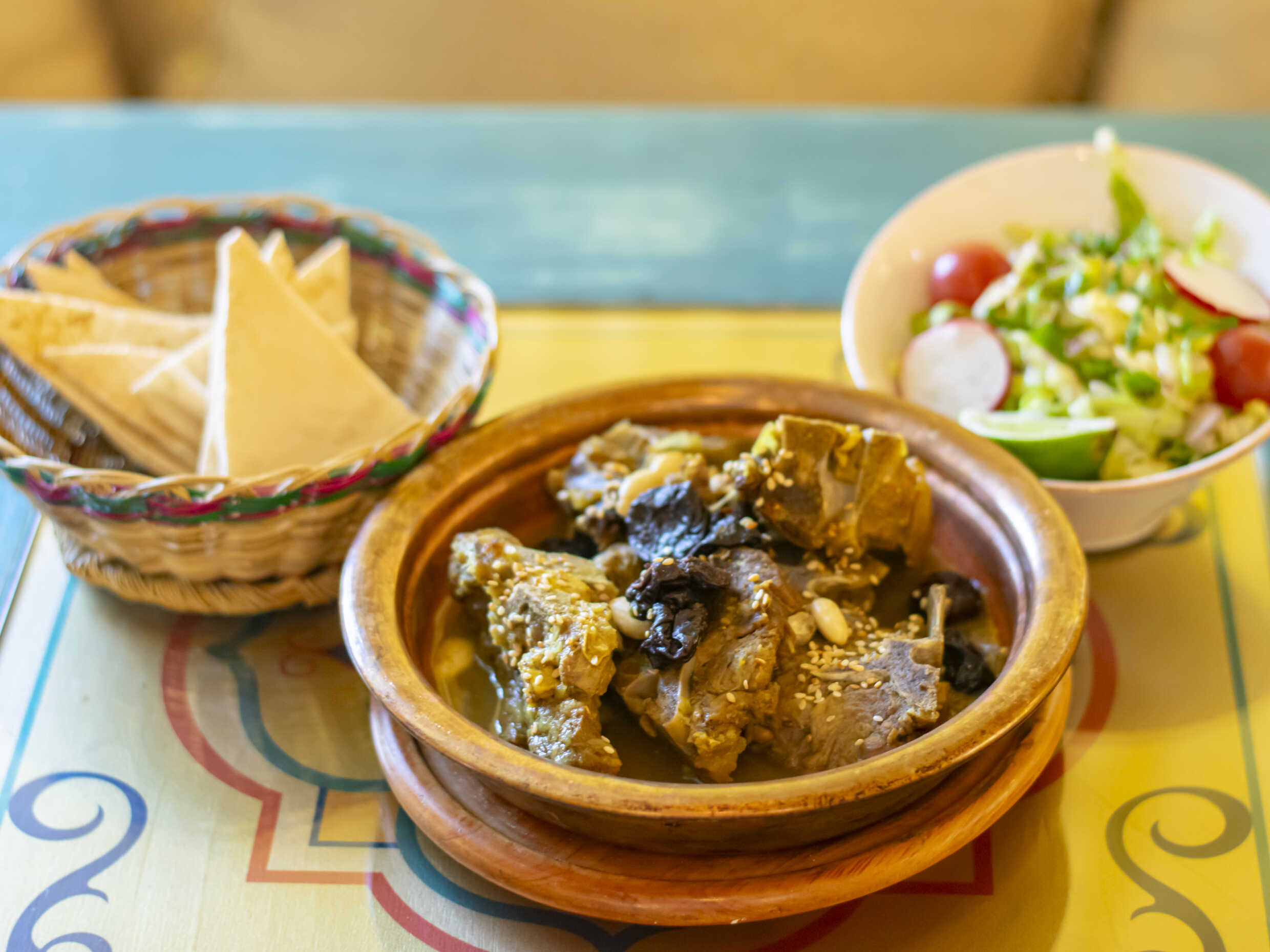 Cordero estofado, ciruelas secas y almendras. Acompañado de pita y ensalada.