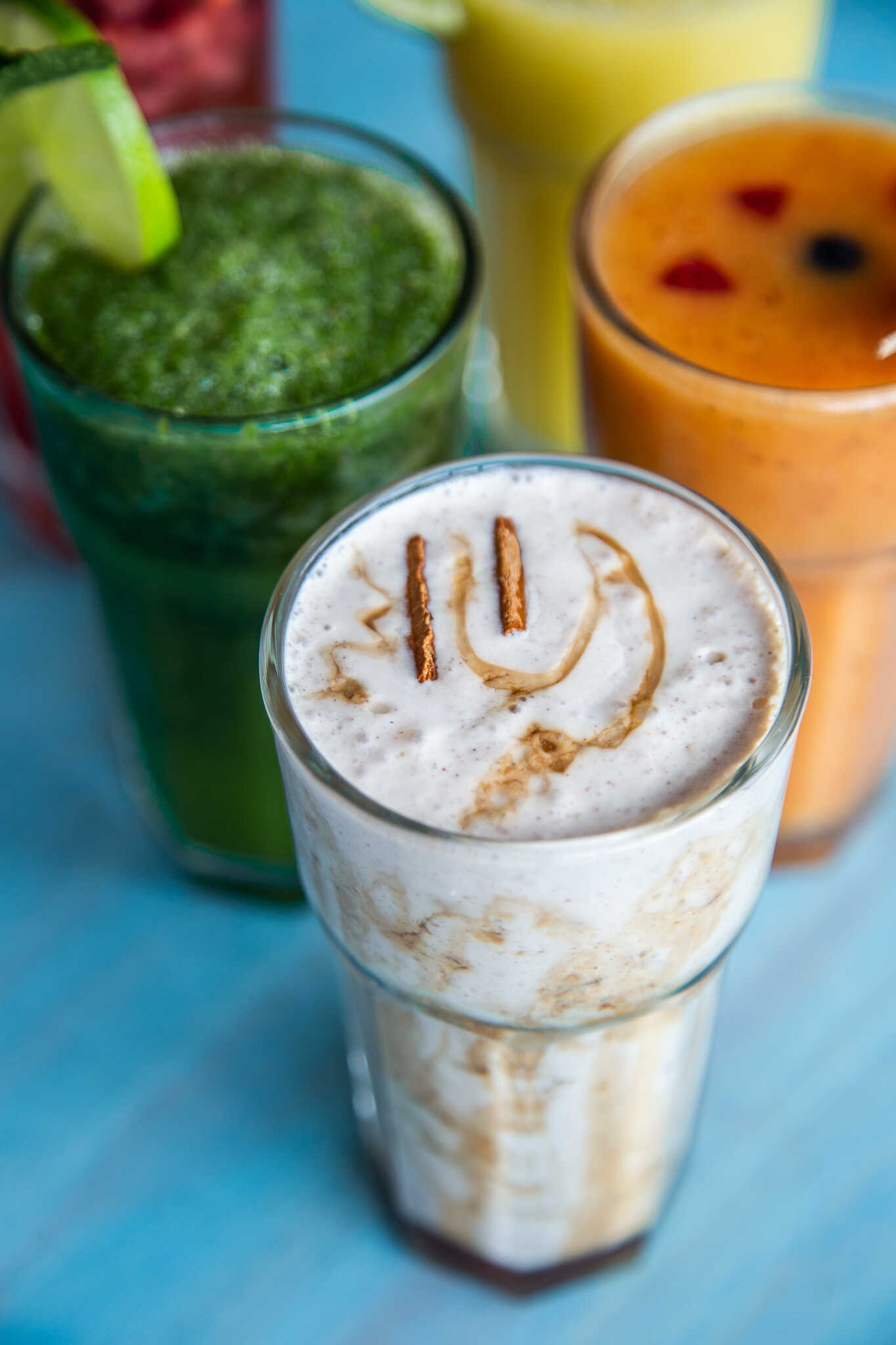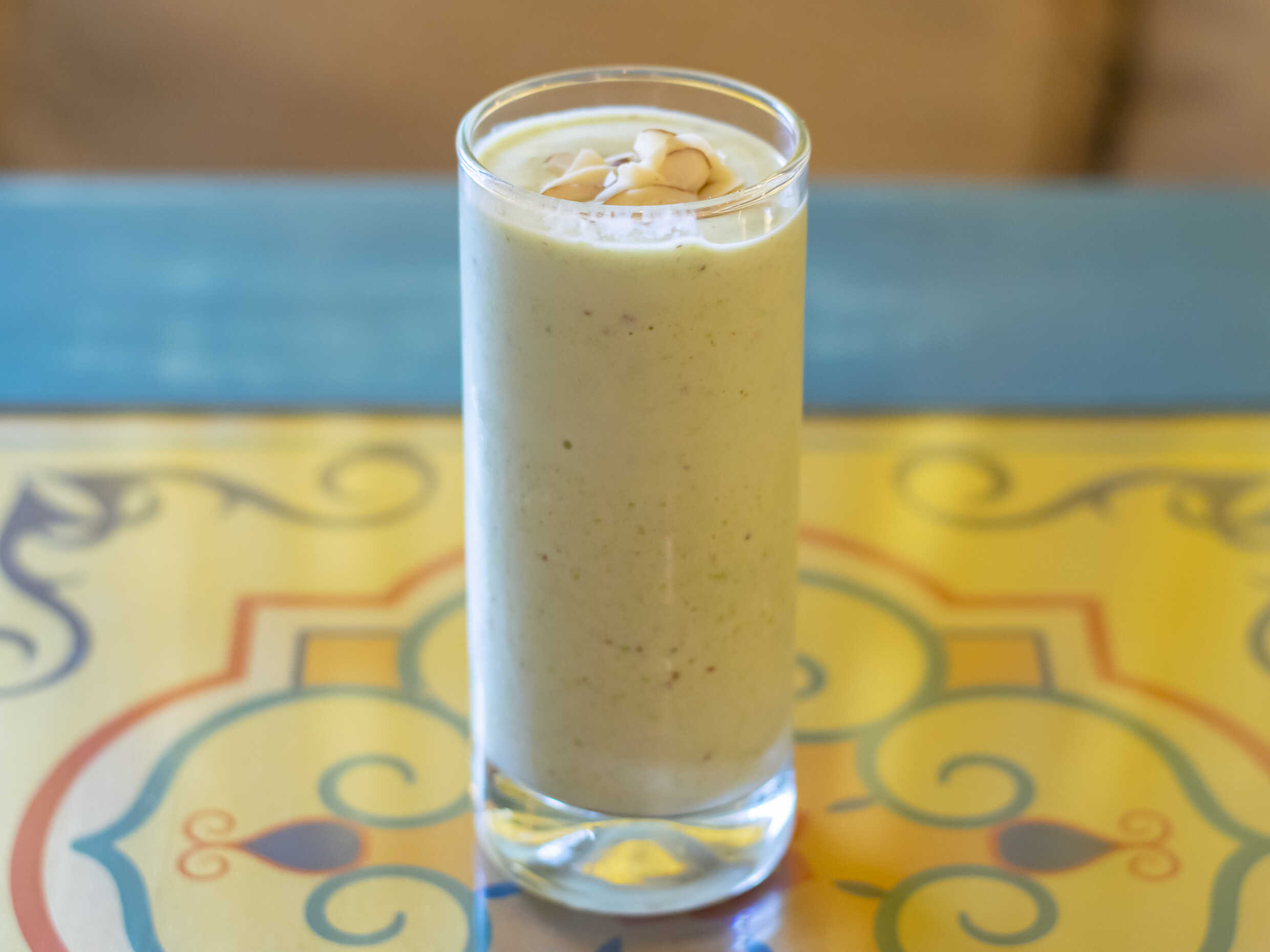Batido de aguacate hass, banano, leche, miel y almendras. Puedes pedirlo en leche vegetal.