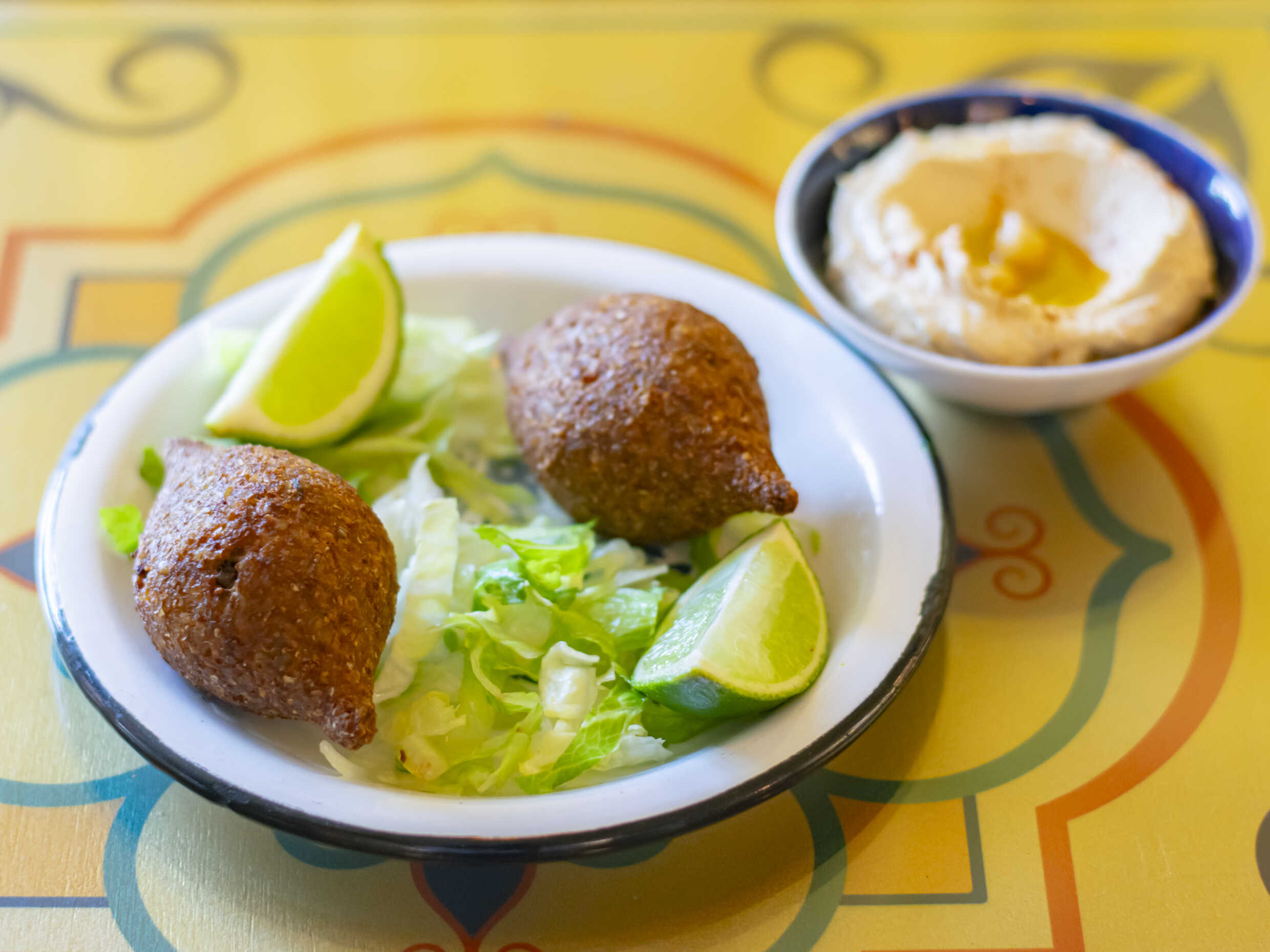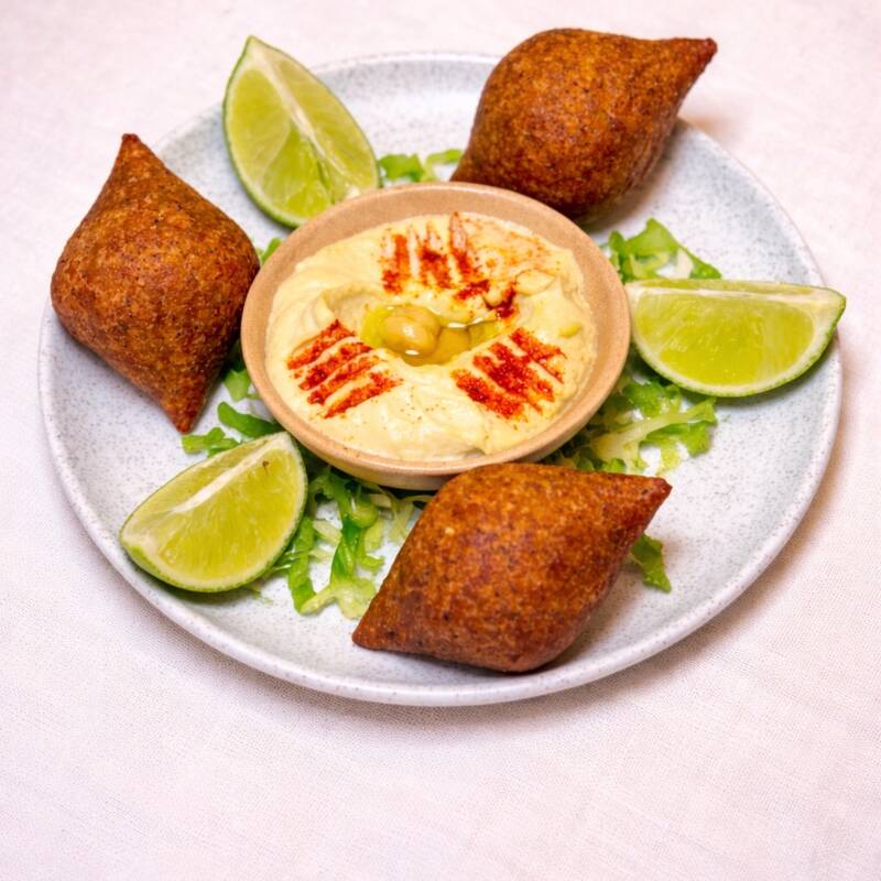 A base de bourgul (trigo) y carne molida. Acompañado de hummus.
