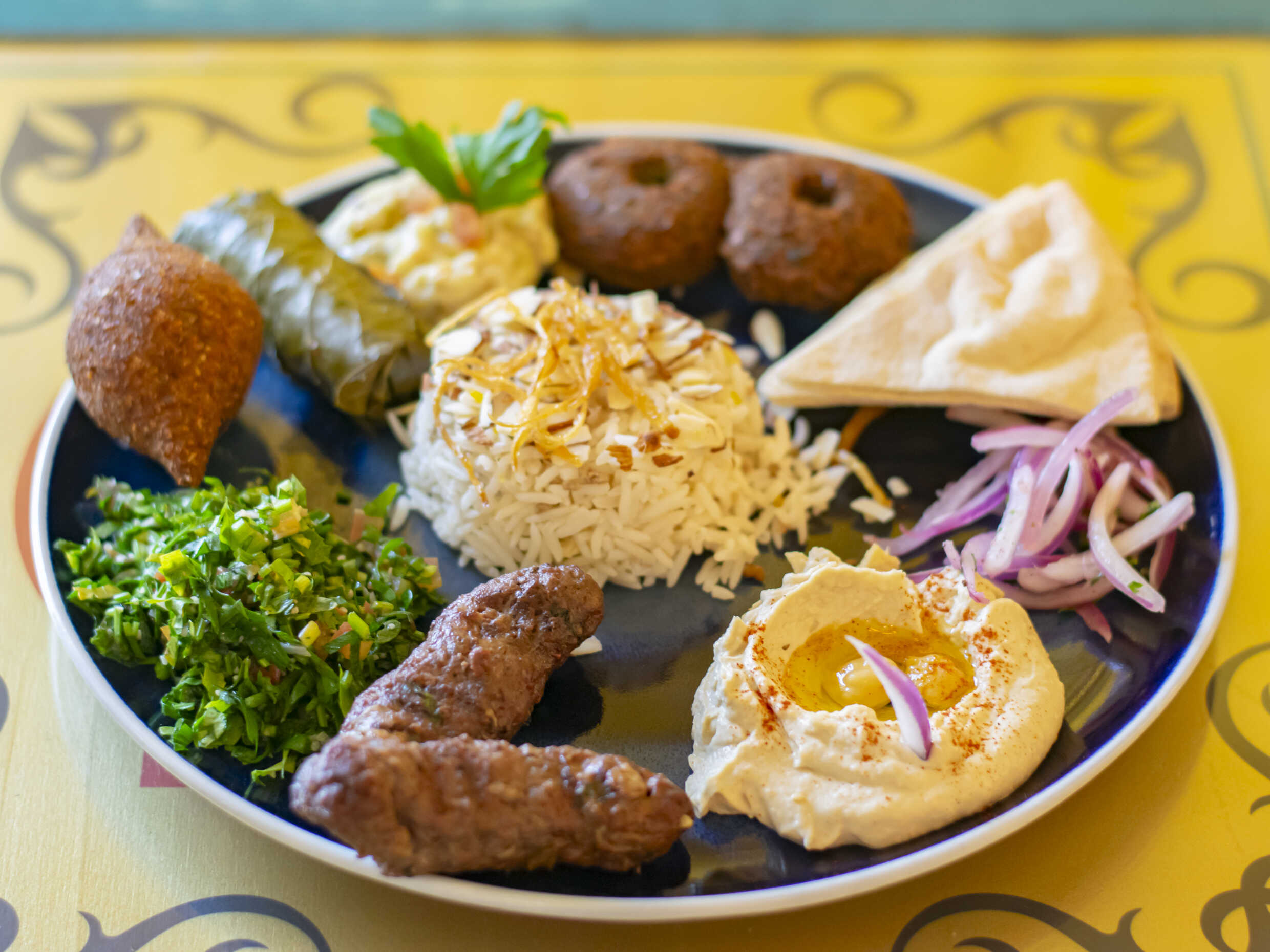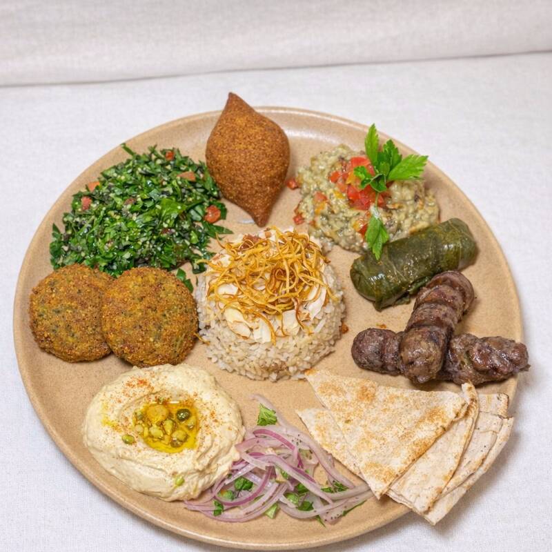 2 Kufta de cordero, 1 kibbeh, 2 falafel, 1 dolma, arroz basmati, hummus, tabule y pita.