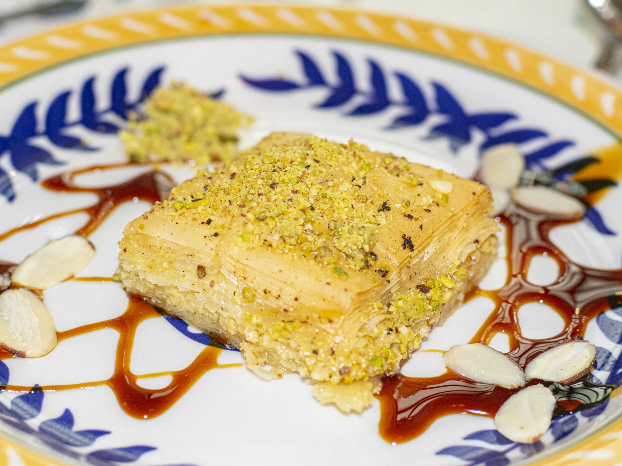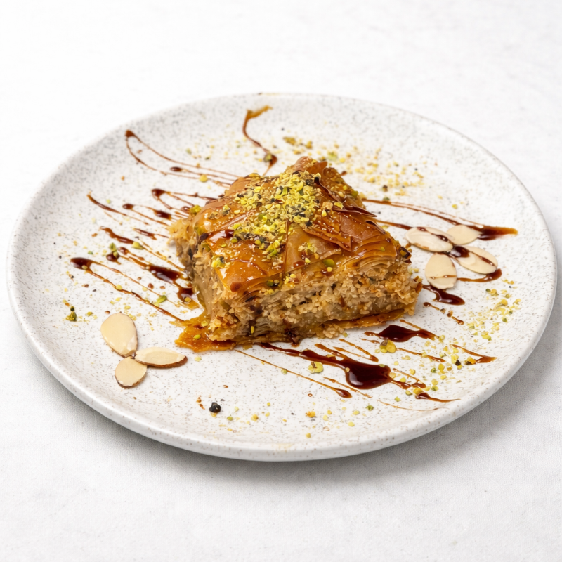 Pasta de almendra triturada, distribuida en una masa filo y bañada en almíbar.