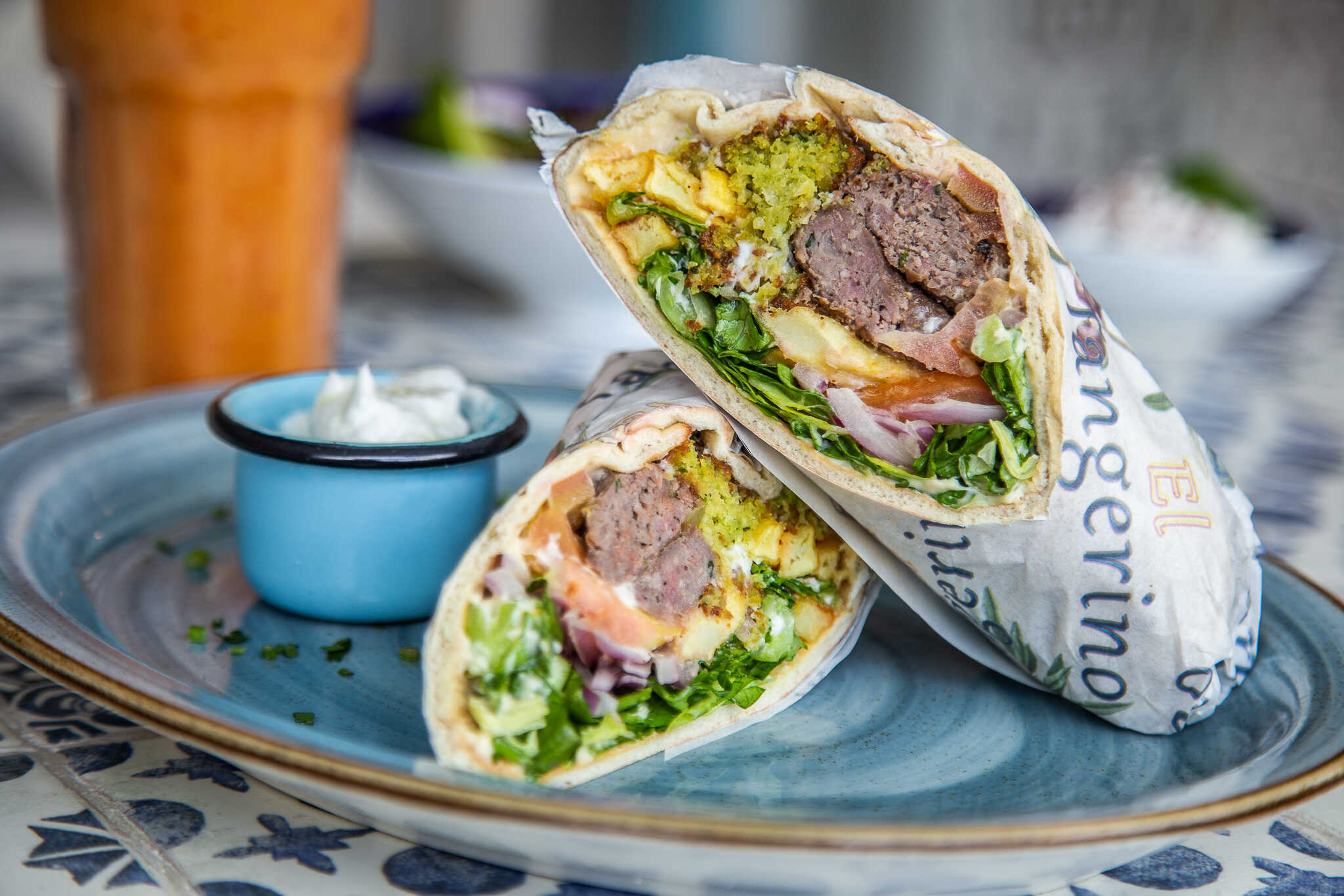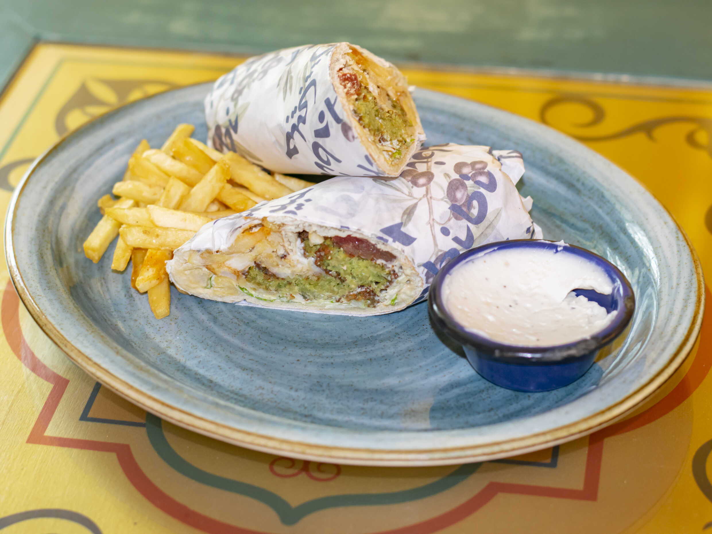 Envuelto en pita con cebolla morada, tomate, perejil, pepinillos, patatas fritas y tahine.