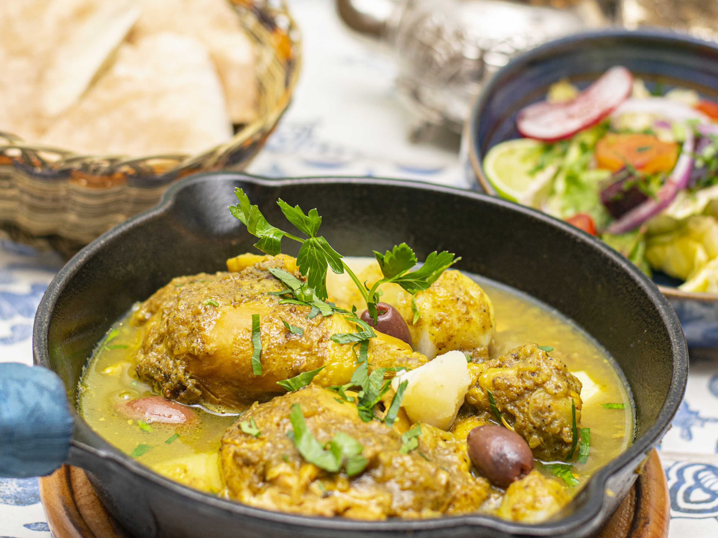 Estofado de colombina de pollo con papas y aceitunas. Acompañado de pita y ensalada.