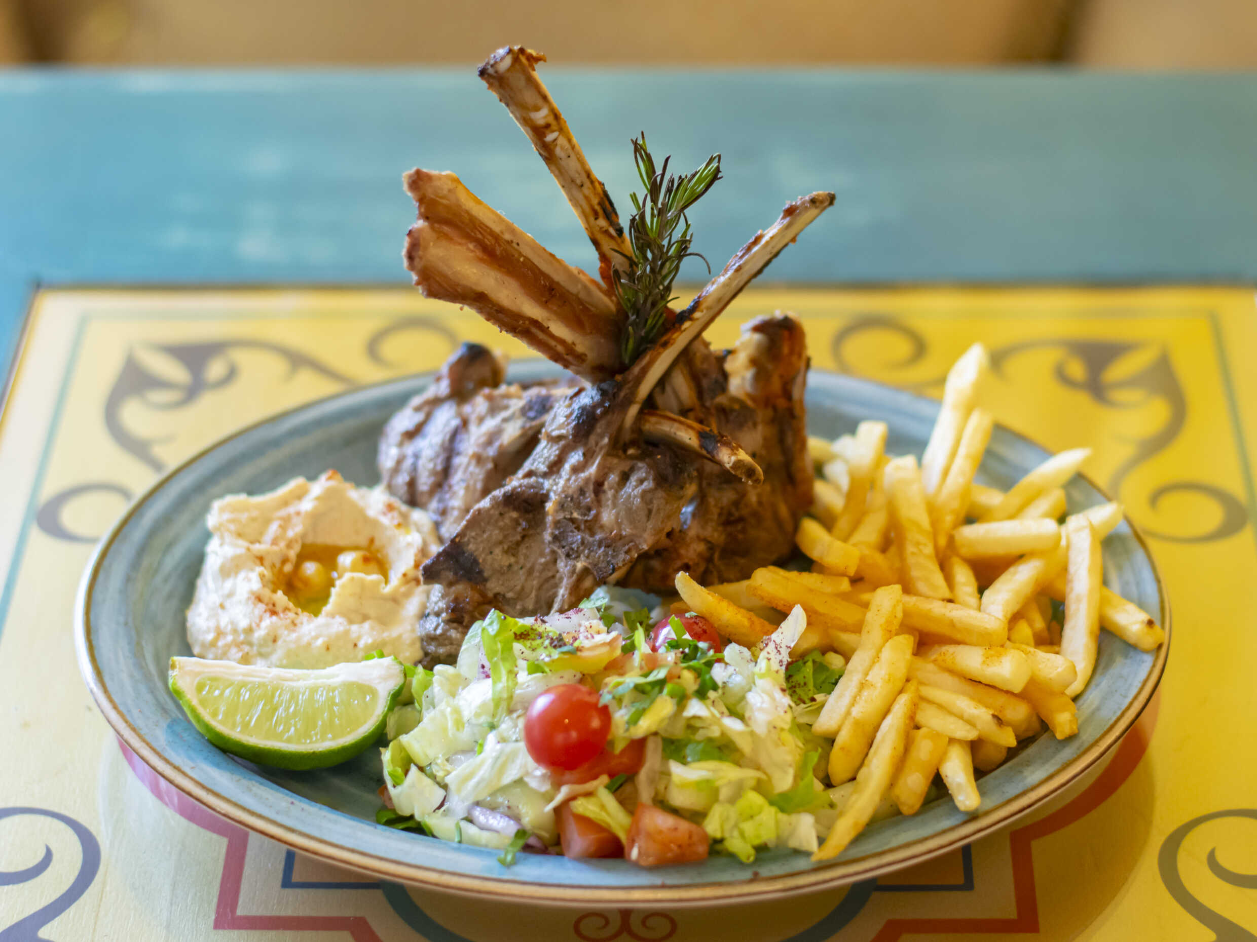 4 Chuletas de cordero asadas. Acompañadas de hummus, patatas fritas y ensalada.