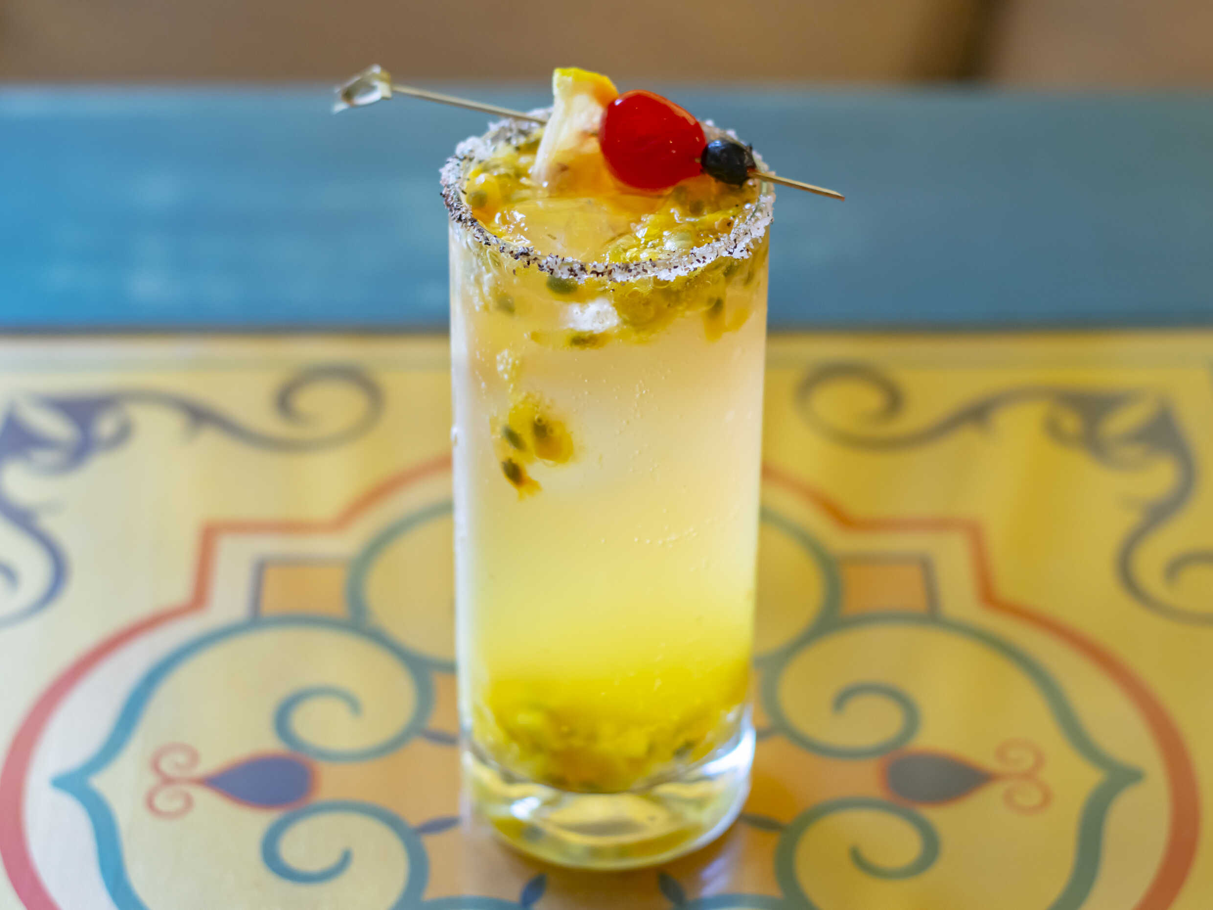 Maracuyá y mango en soda michelada con sal y pimienta.